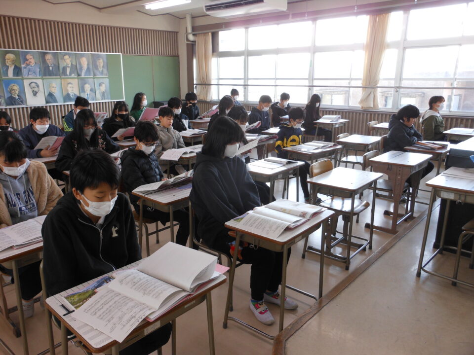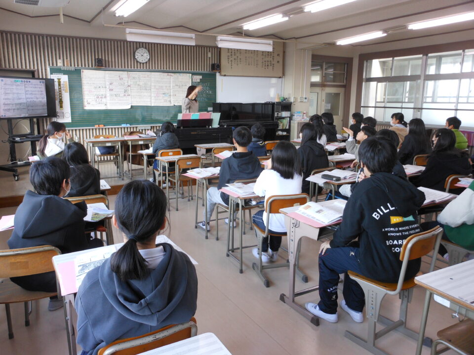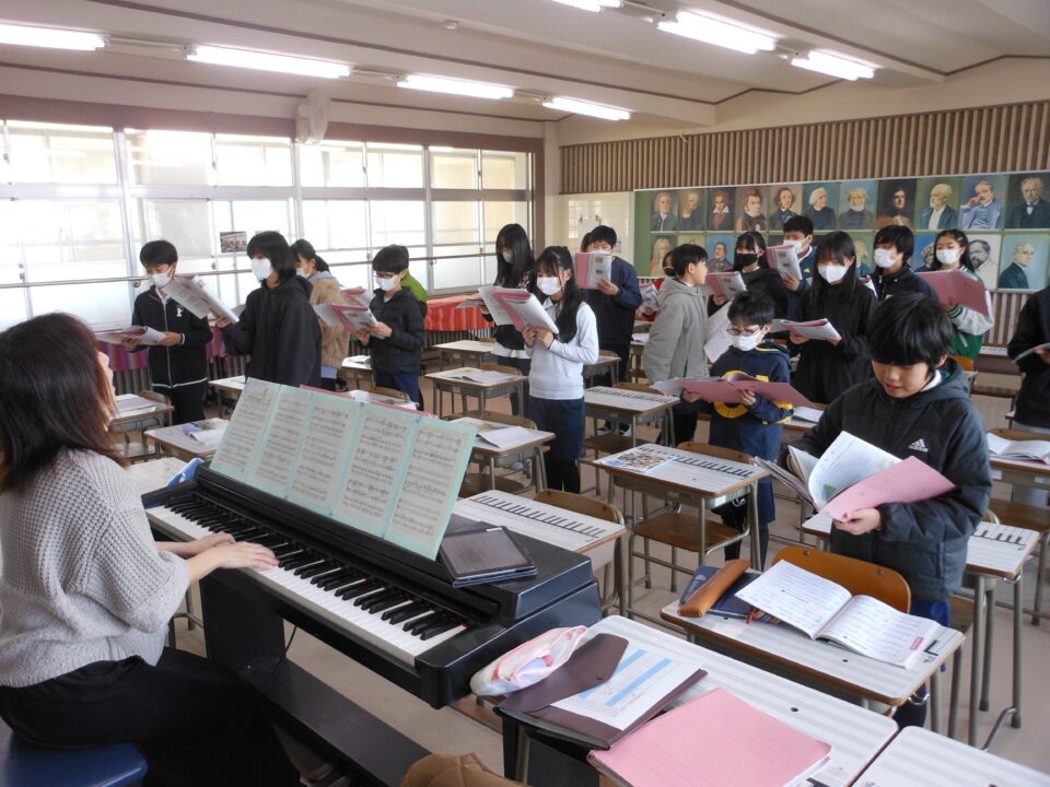 年生ねんせいでは、音楽おんがく時間じかんに「旅立たびだちのに」を練習れんしゅうしています。このきょくは、卒業式そつぎょうしきうたきょくで、今日きょうはのばすおとけながら練習れんしゅうしました。指導者しどうしゃ伴奏ばんそうわせてどもたちがうたすと、音楽室中おんがくしつじゅう歌声うたごえひびわたっていました。