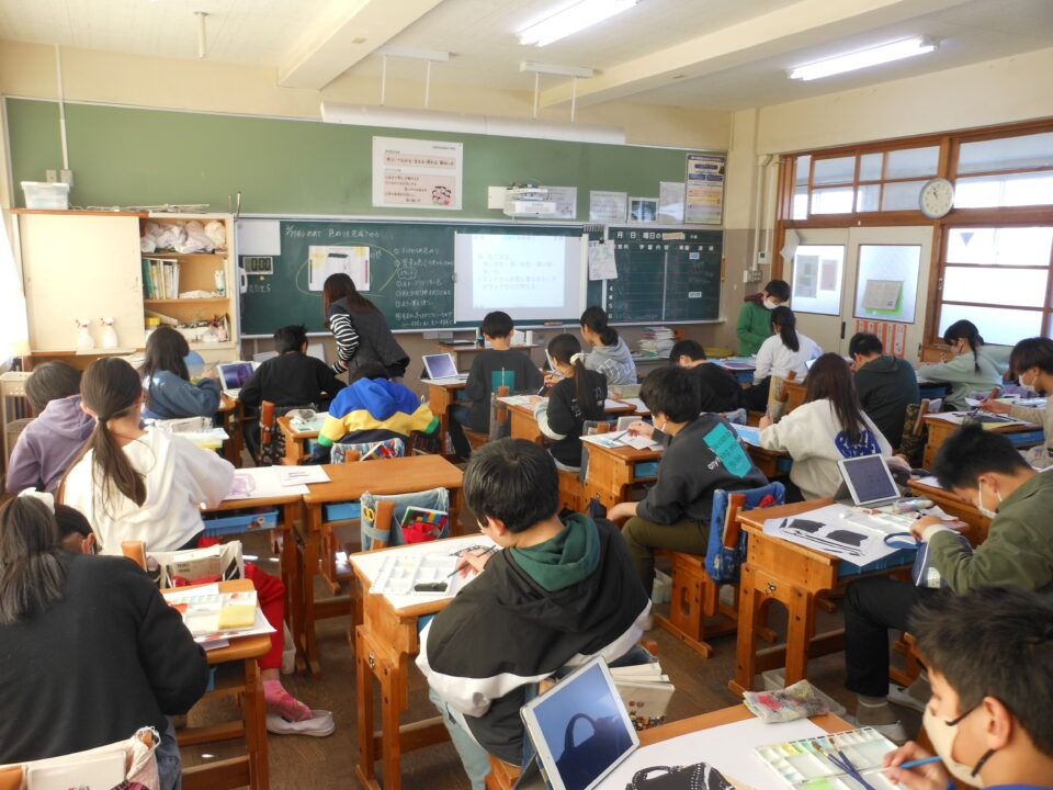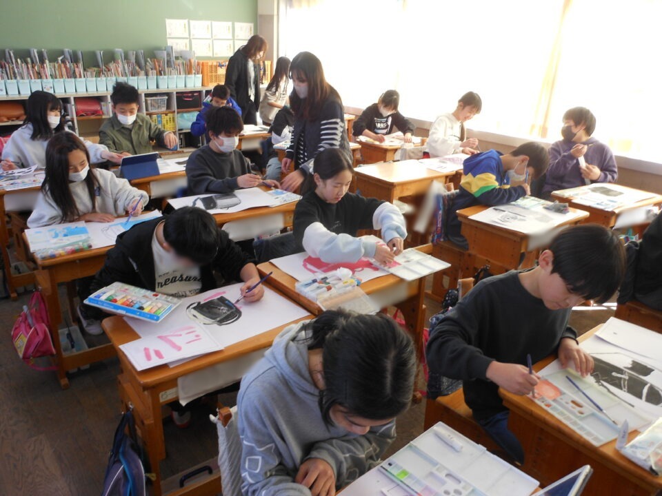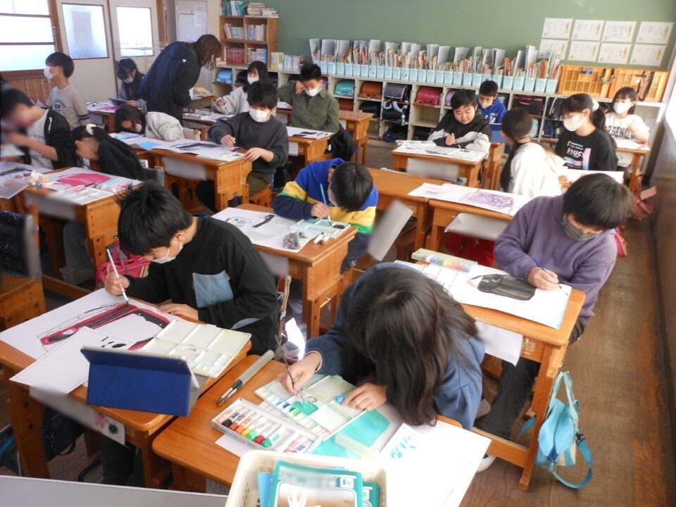 図工ずこう時間じかんにランドセルをいています。小学校しょうがっこう年間ねんかんおもがたくさんつまったランドセル。どもたちは、使つかって一色いっしょく一色いっしょく丁寧ていねいいろをぬっていました。