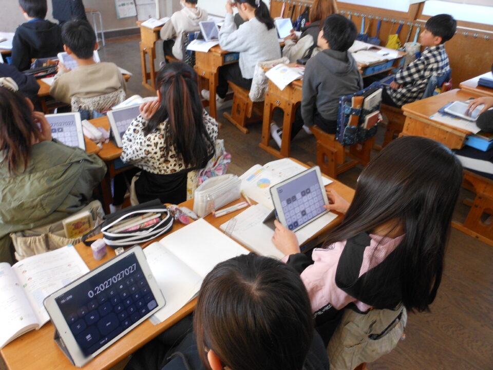 算数さんすうでは、おびグラフ・えんグラフを学習がくしゅうしています。項目こうもくめる割合わりあいもとめてからグラフにあらわすのですが、計算けいさん大変たいへんなので、タブレットの電卓でんたく機能きのう活用かつようしながら学習がくしゅうすすめています。