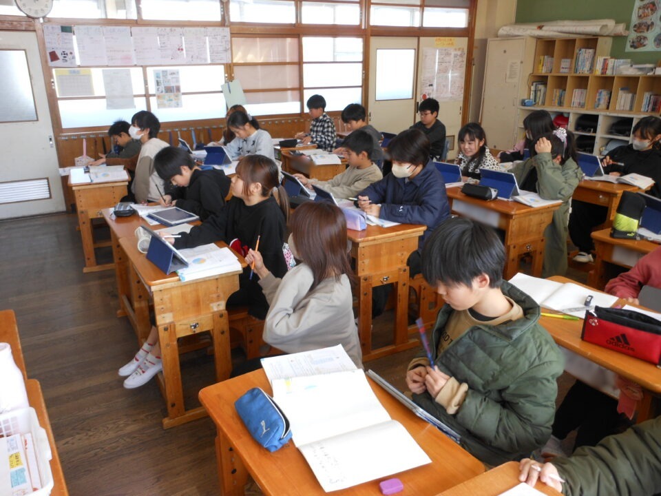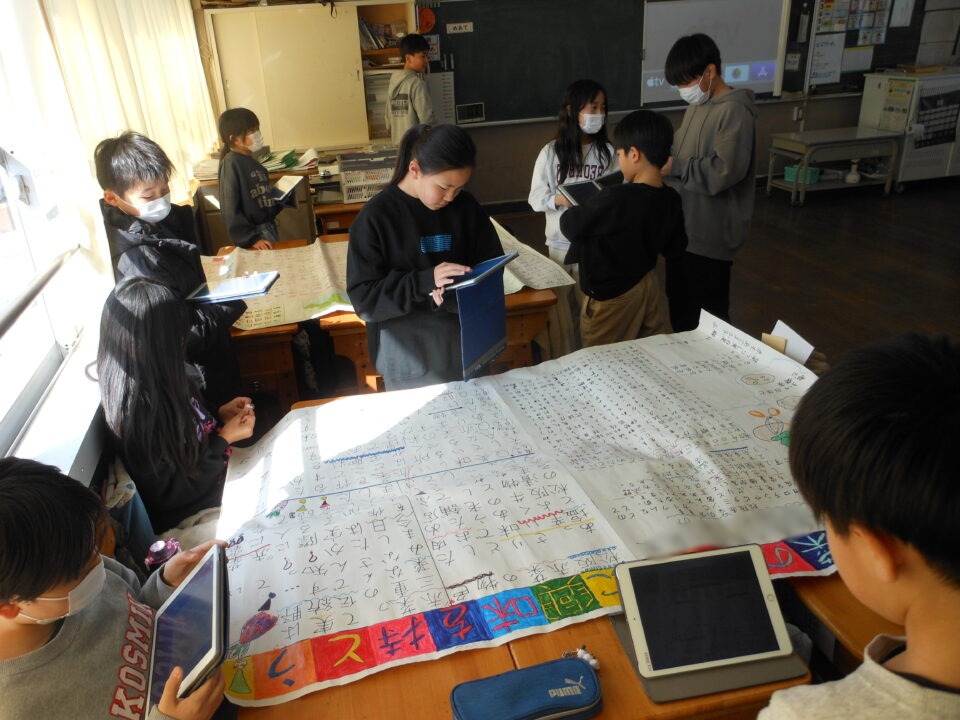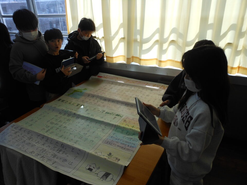 総合そうごう時間じかんに、農業生産のうぎょうせいさんについてそれぞれグループでテーマをめ、調しらべたことを新聞しんぶんにまとめています。どのグループも完成かんせいちかづき、つぎおこな交流会こうりゅうかいけて準備じゅんびすすめています。
