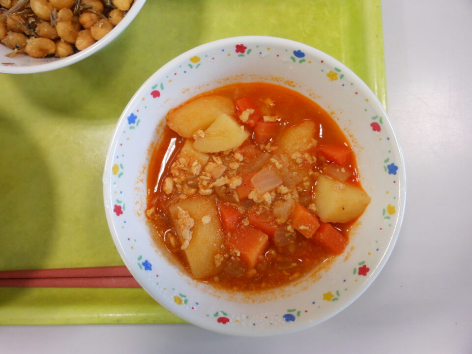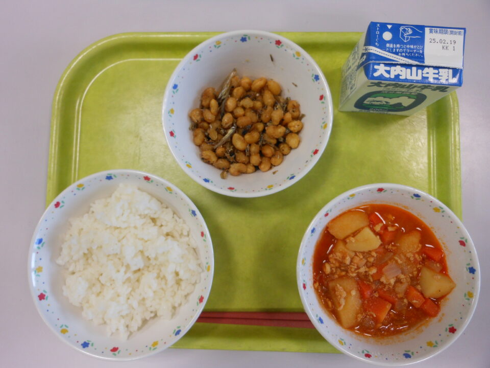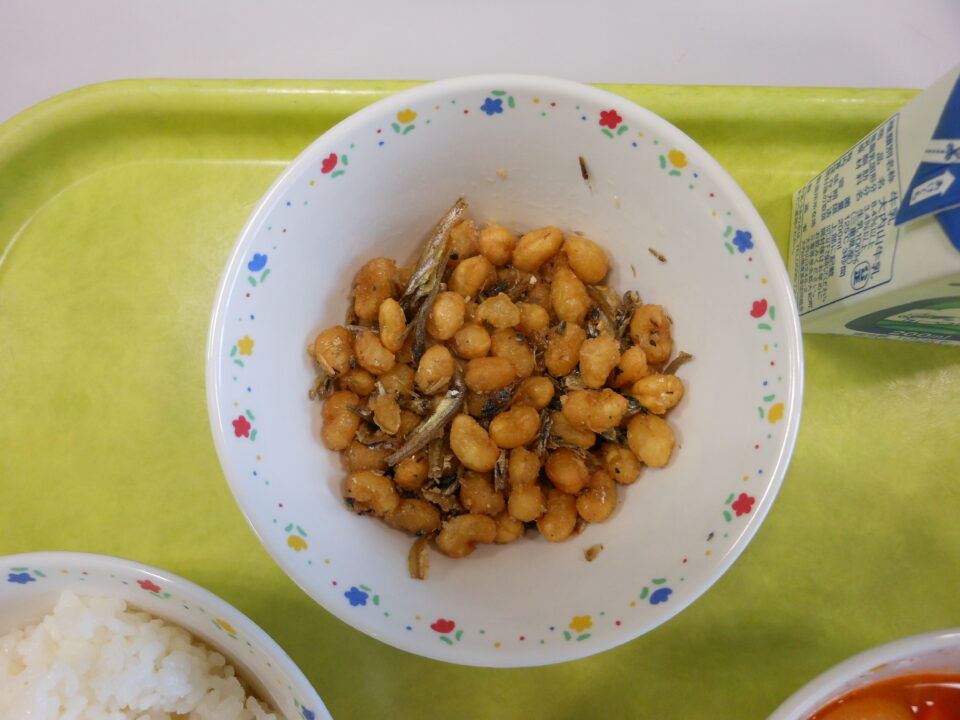 今日きょう給食きゅうしょくは、ごはん牛乳ぎゅうにゅう、ギニーリン、小魚こざかなりフライビーンズでした。