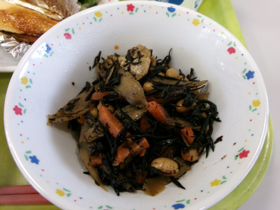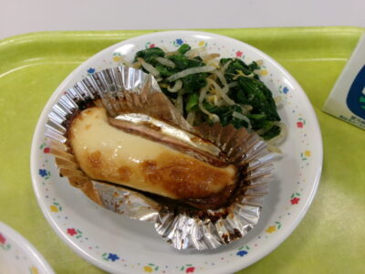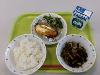 今日の給食は、ご飯、牛乳、さけのマヨネーズ焼き、ほうれん草入りごま和え、いそ煮でした。