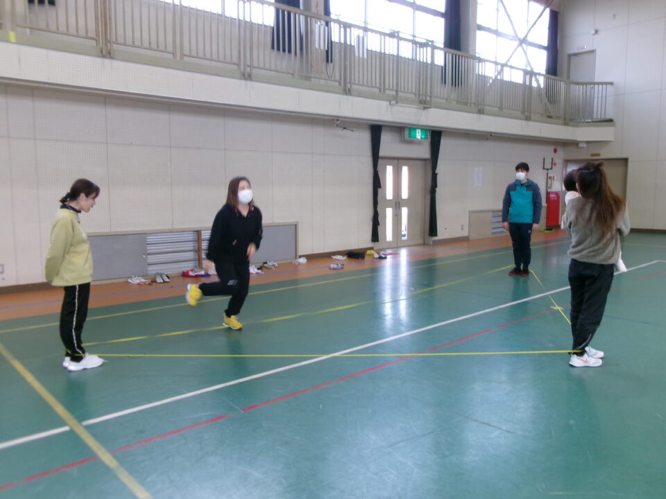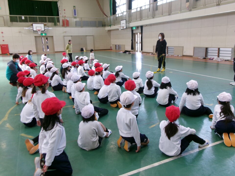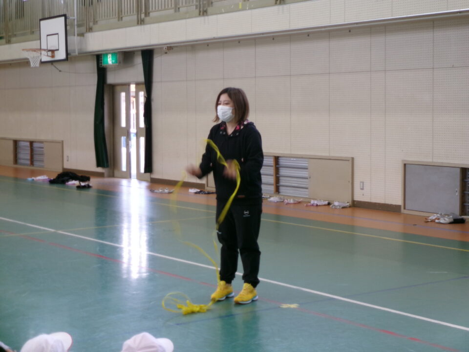 今日は、保護者の方に来ていただき、小さい頃に中国で遊んだことのある「ゴム跳び」を教えていただきました。