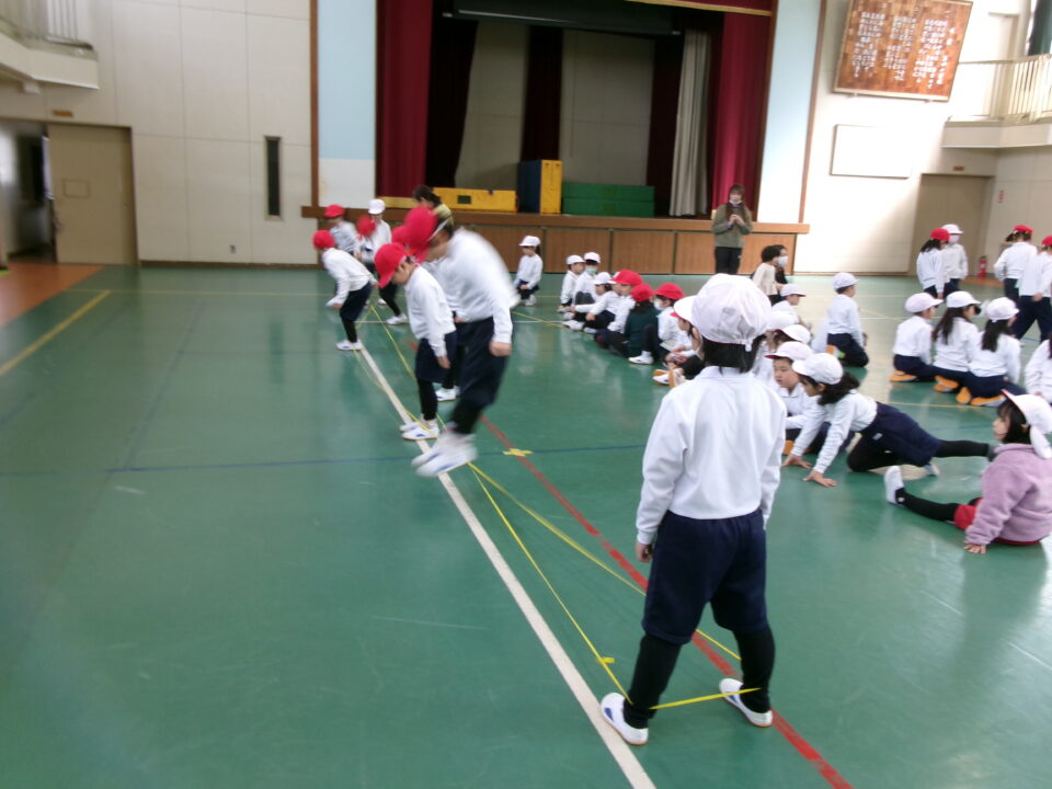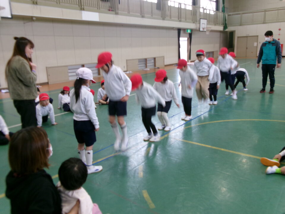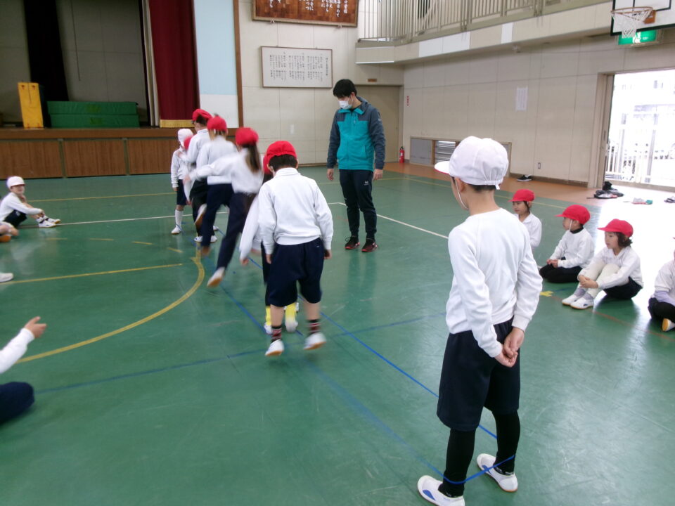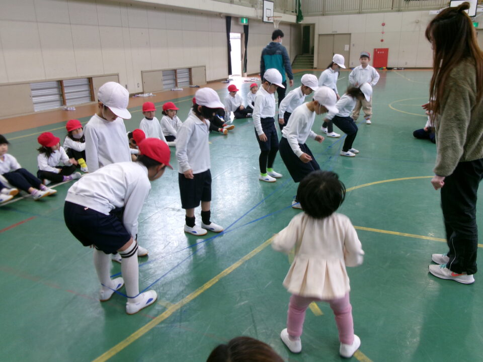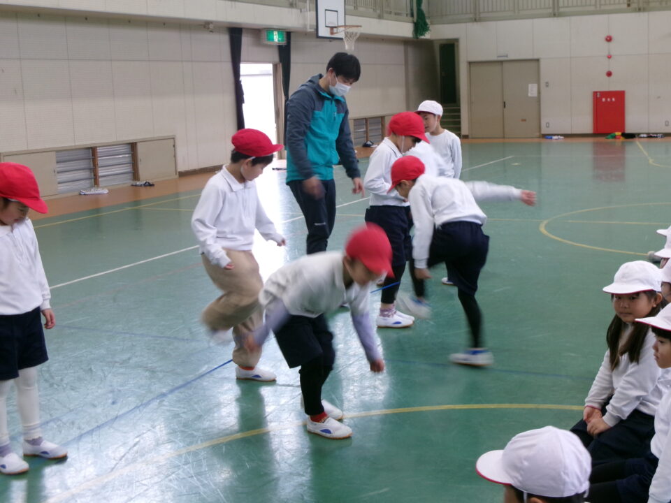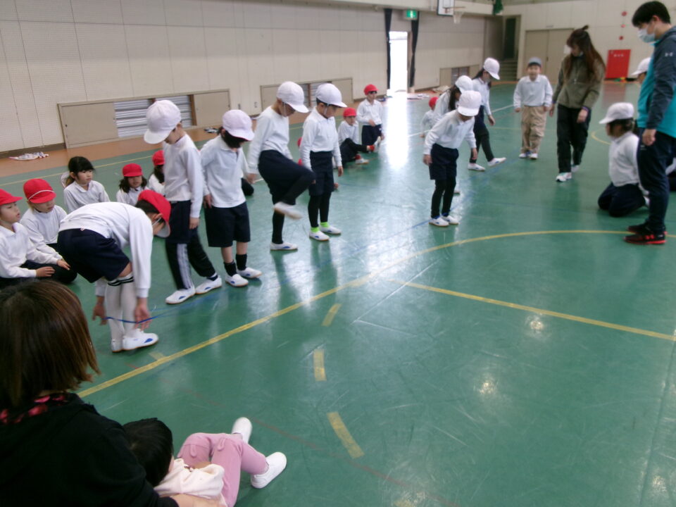 「グ~ パ~ グ~ パ~ グ~ (で足を引っかけて) チョキ ピョン」と見本を見せてもらいました。