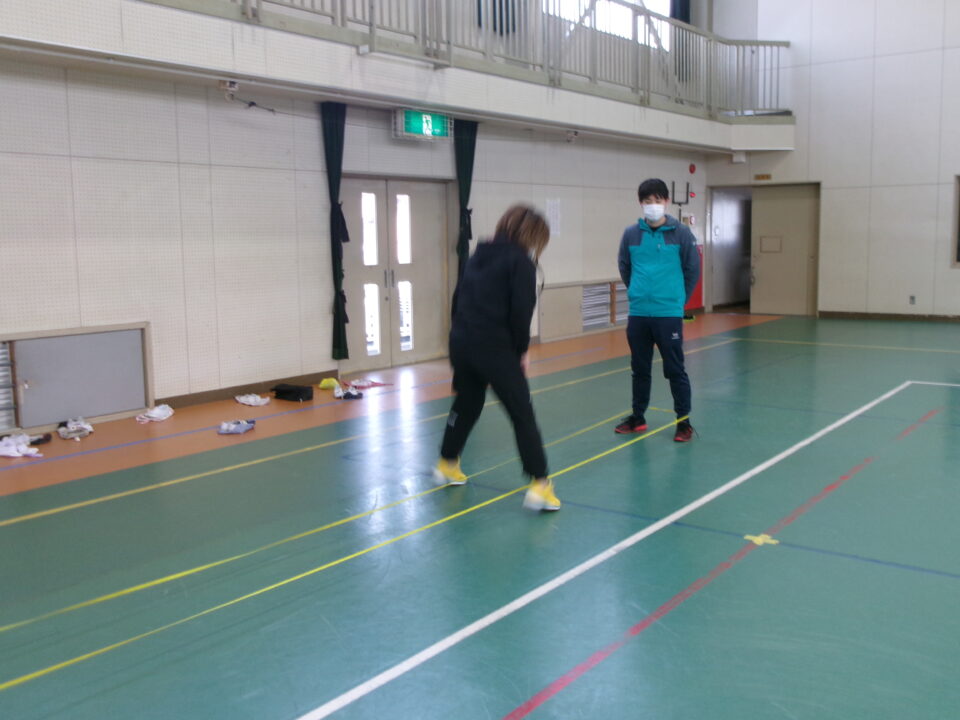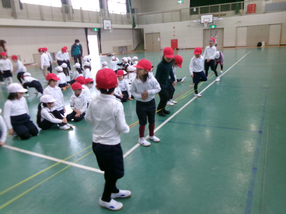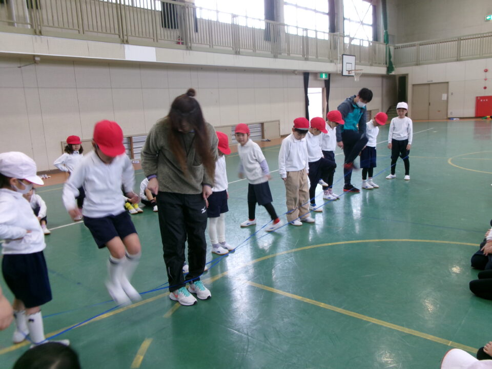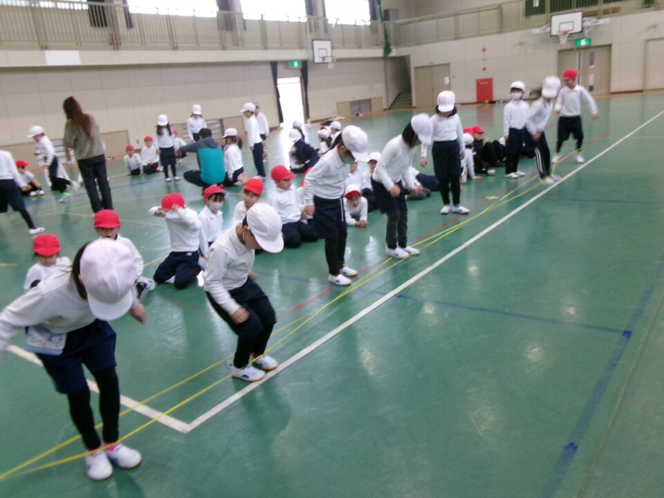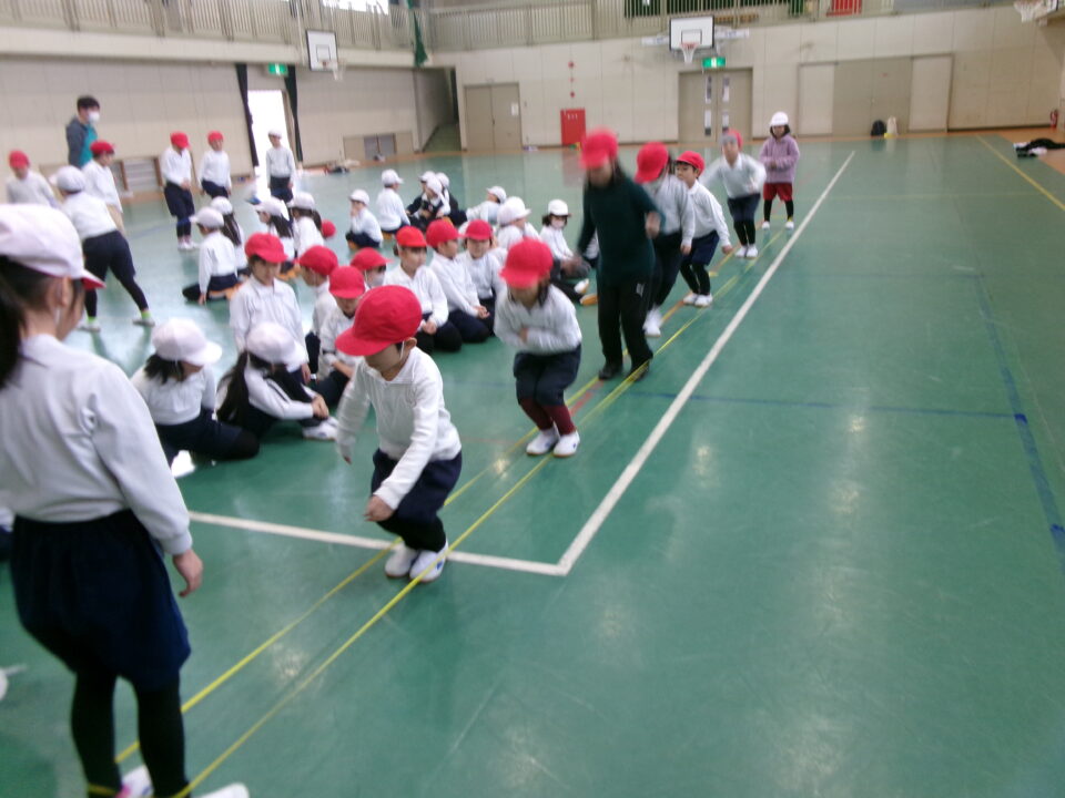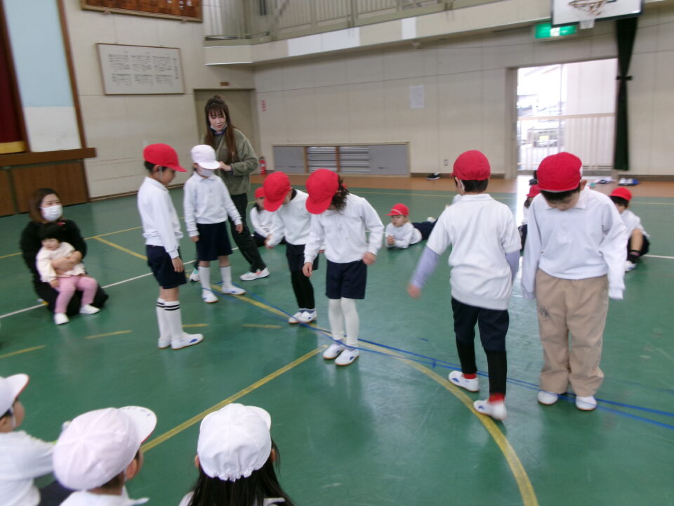 「グ~ パ~ グ~ パ~ グ~ (で足を引っかけて) チョキ ピョン」と見本を見せてもらいました。