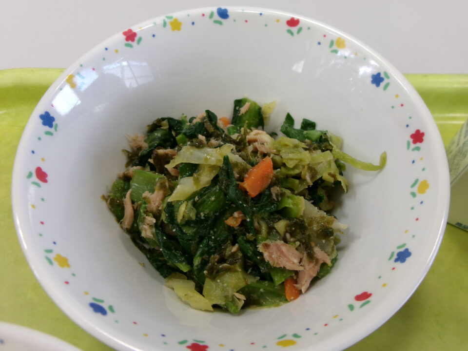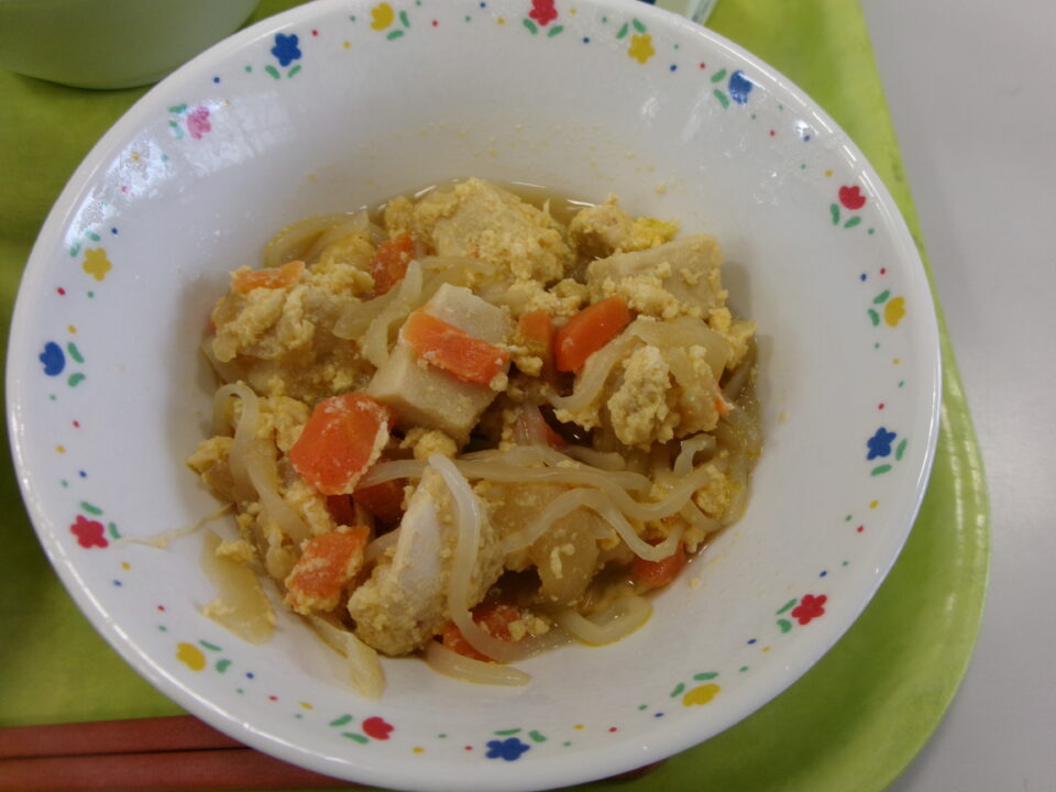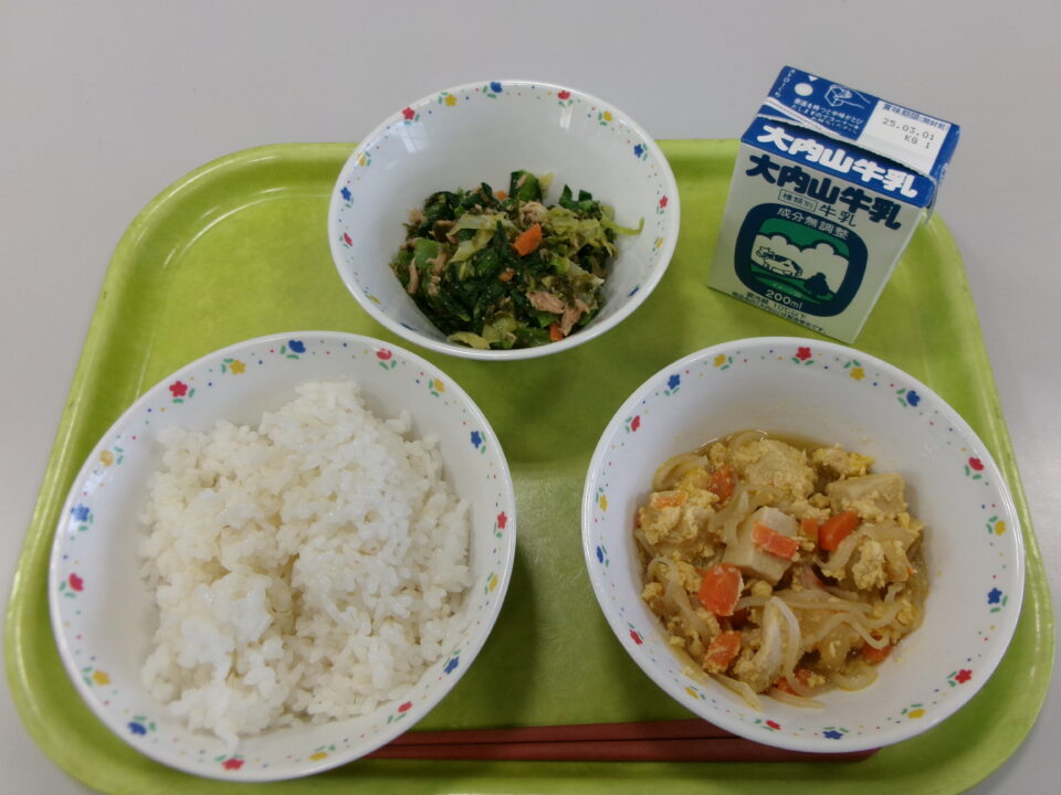 今日の給食は、ご飯(麦入り)、牛乳、高野豆腐の卵とじ、小松菜ののり酢和えでした。
