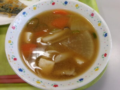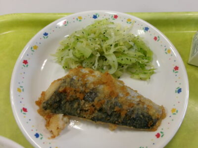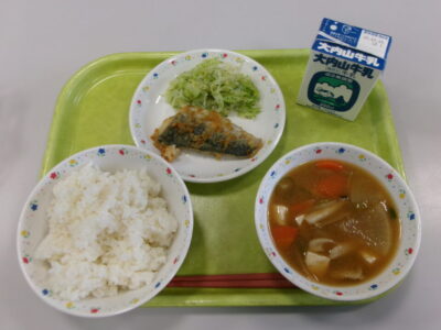 今日の給食は、ご飯、牛乳、さわらの和風バーベキューソース、キャベツの青じそ和え、豚汁でした。