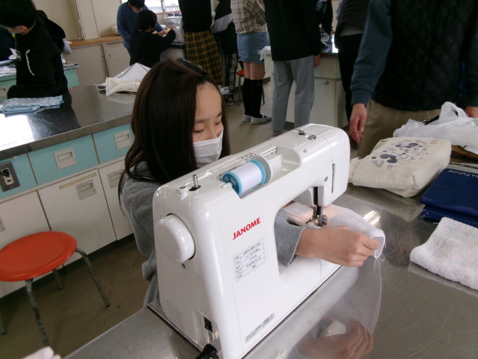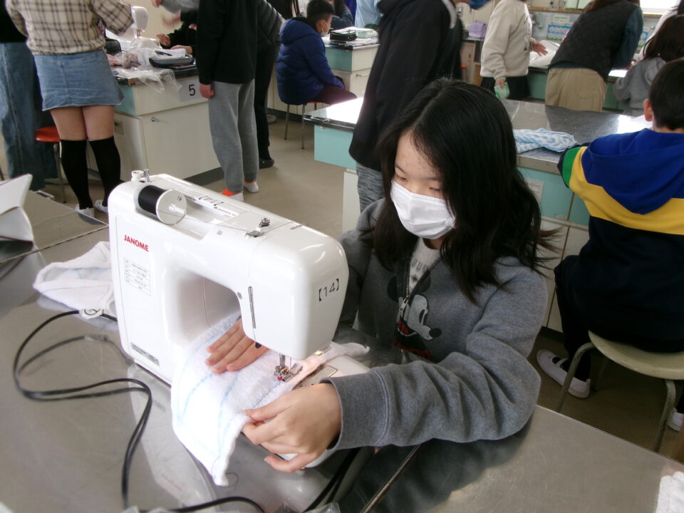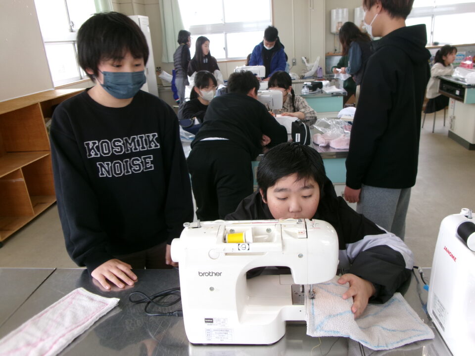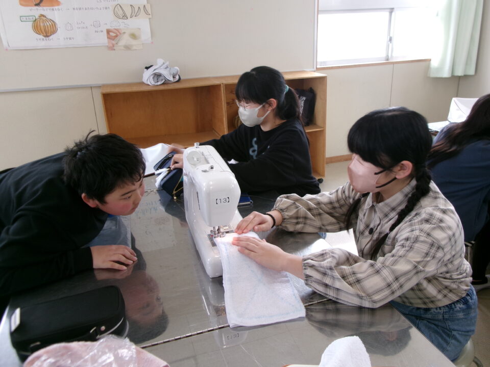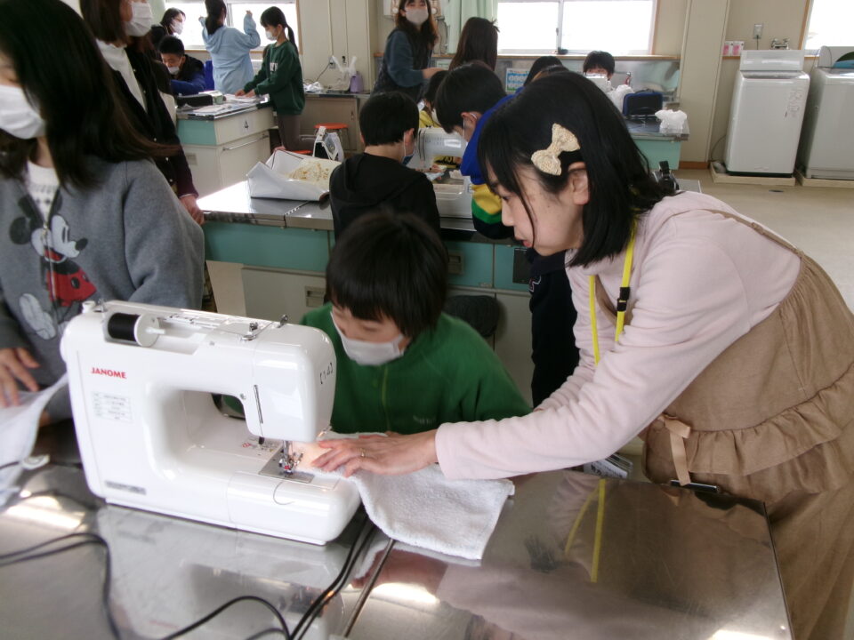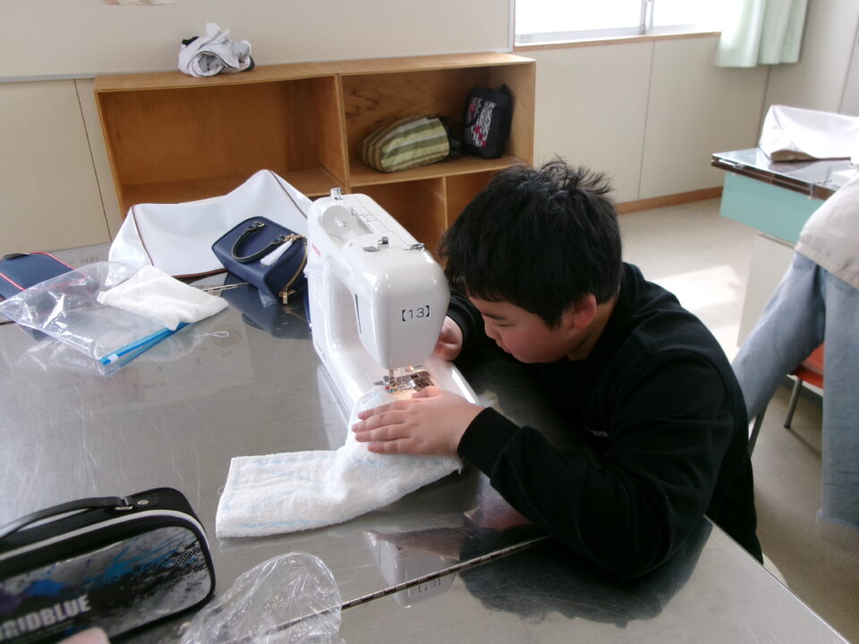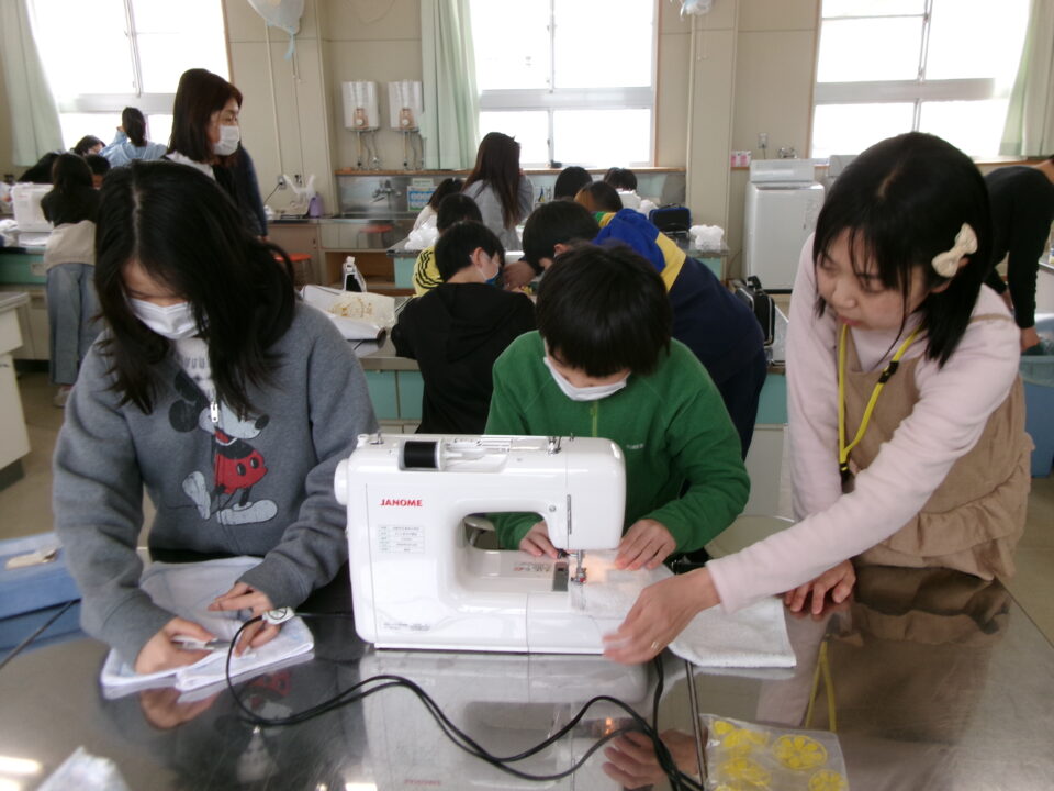 年生ねんせいでは、卒業間近そつぎょうまぢかとなり掃除そうじ使つかうためのぞうきんづくりをしています。いえから使つかっていたタオルをってきて、SDG’sの観点かんてんからてずに有効活用ゆうこうかつようをします。