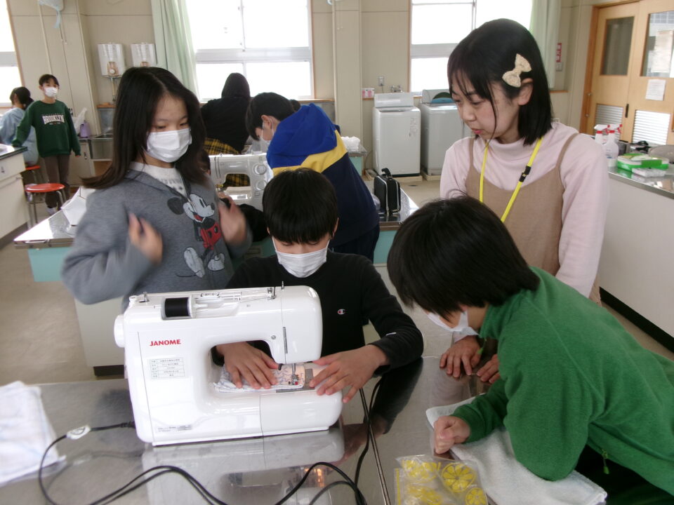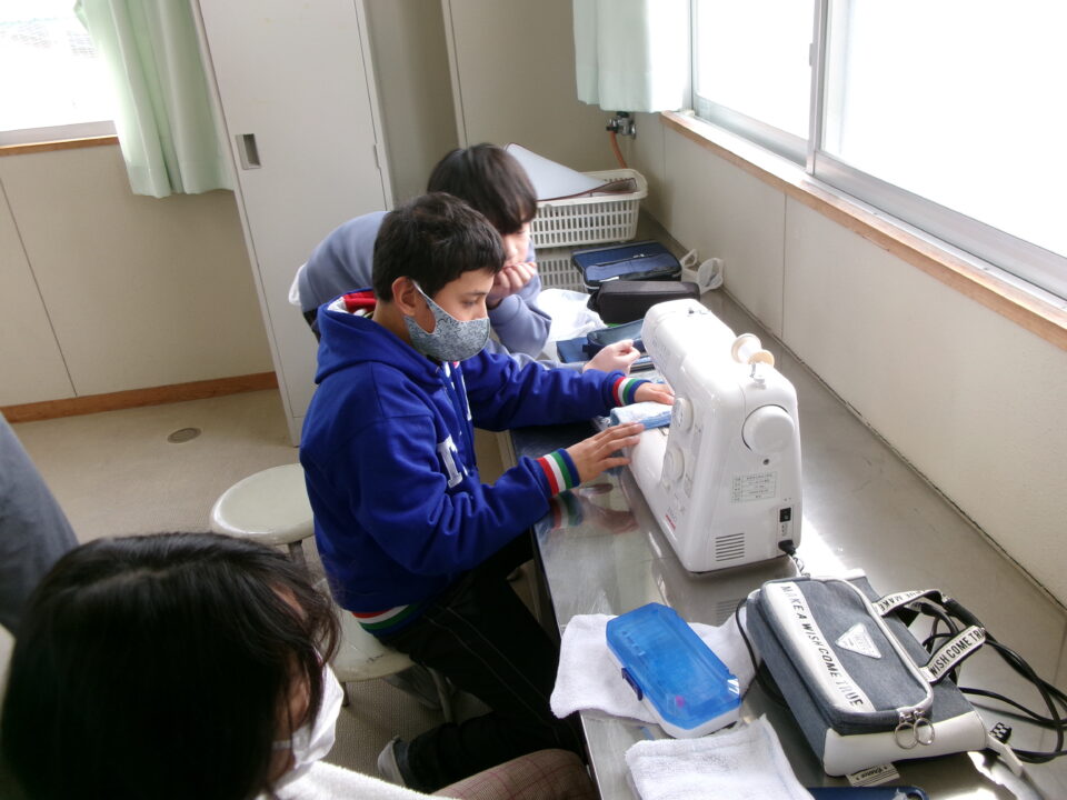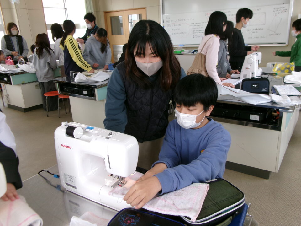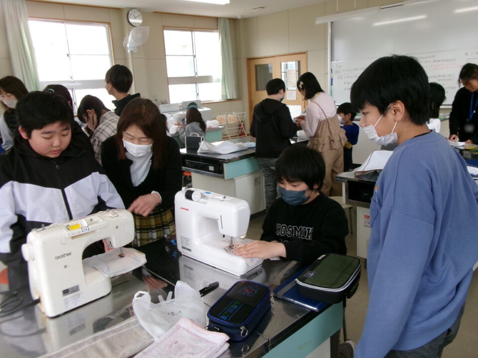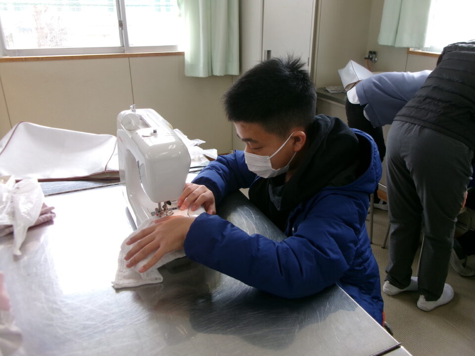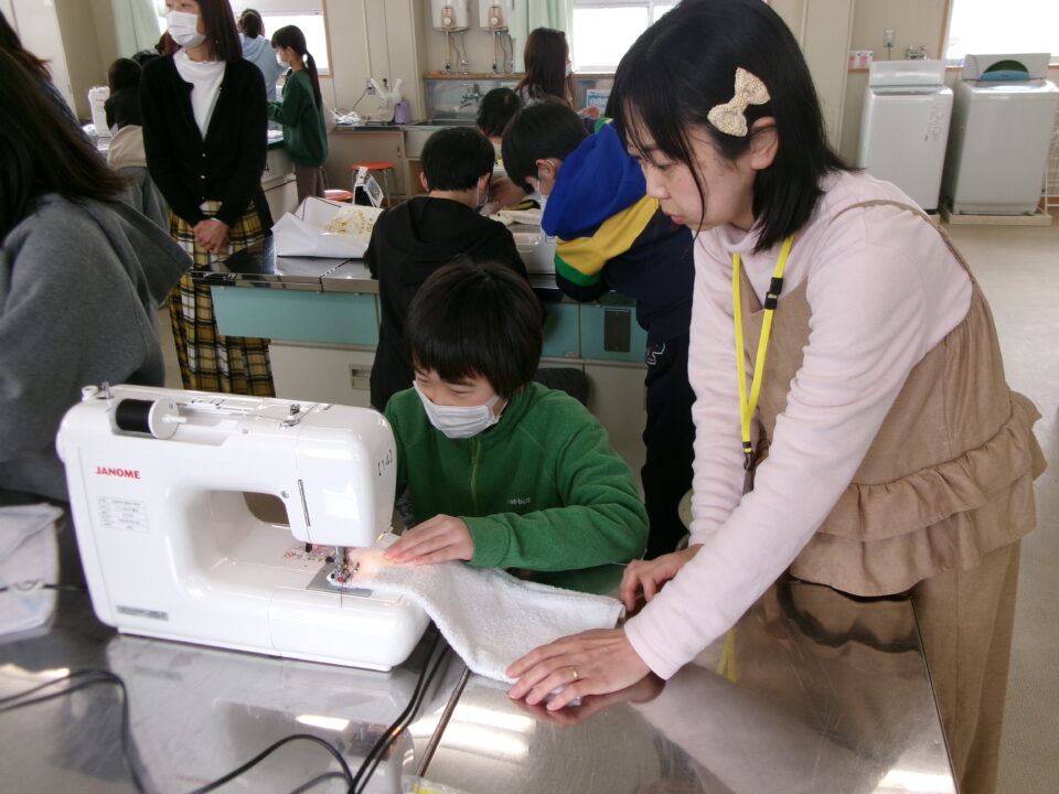 年生ねんせいでは、卒業間近そつぎょうまぢかとなり掃除そうじ使つかうためのぞうきんづくりをしています。いえから使つかっていたタオルをってきて、SDG’sの観点かんてんからてずに有効活用ゆうこうかつようをします。