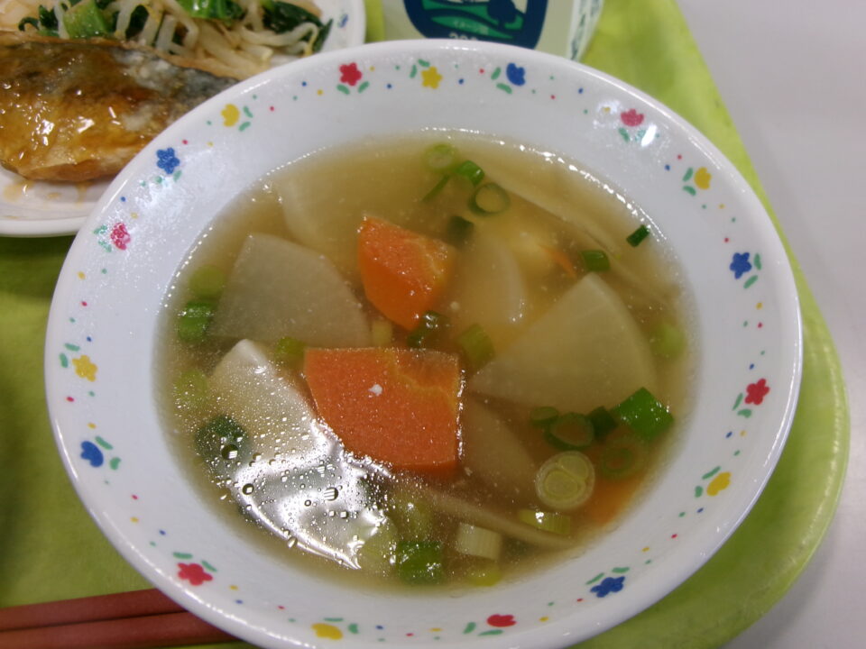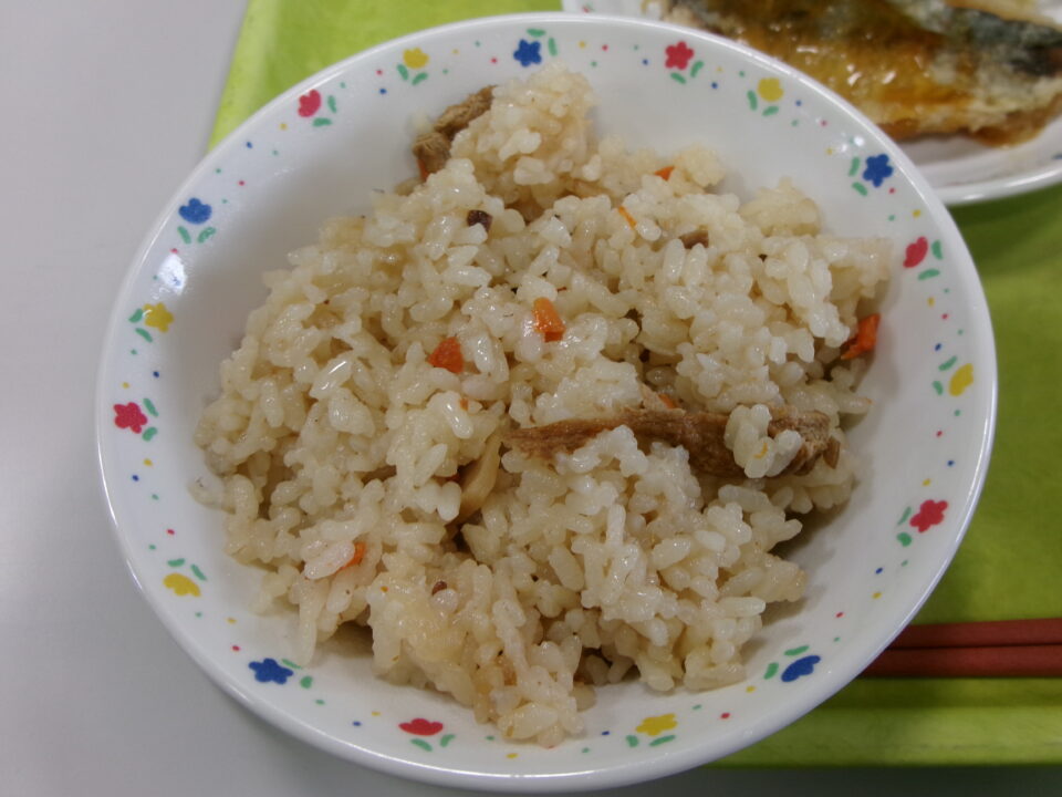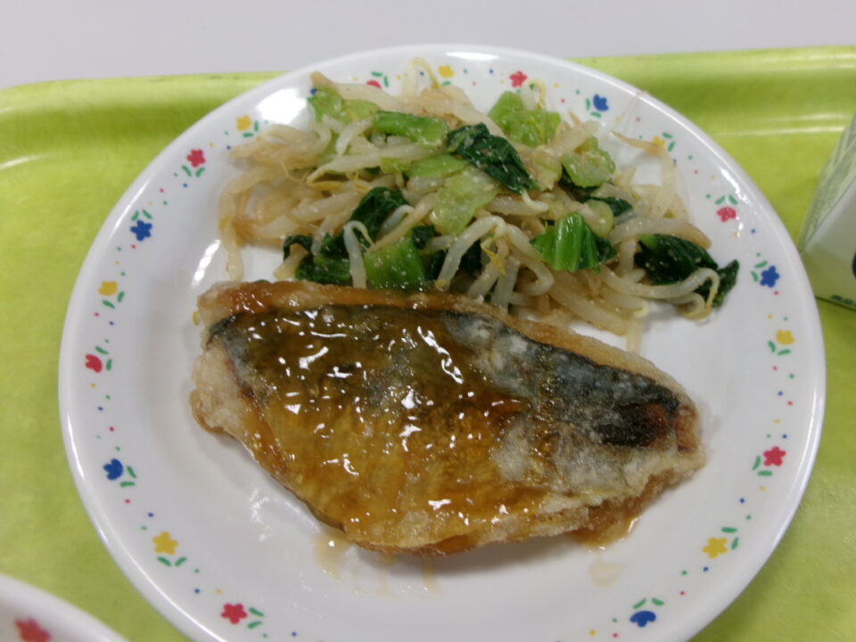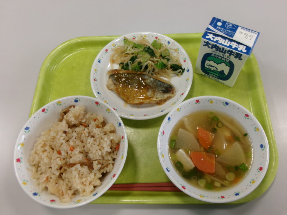 今日きょう給食きゅうしょくは、五目ごもくはん牛乳ぎゅうにゅう、あじのてり、チンゲンサイのごまえ、けんちんじるでした。