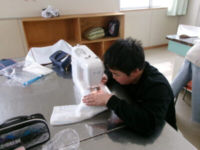 6年生では、卒業間近となり掃除で使うためのぞうきん作りをしています。家から使っていたタオルを持ってきて、SDG’sの観点から捨てずに有効活用をします。