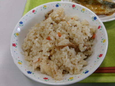 今日の給食は、五目ご飯、牛乳、あじのてり煮、チンゲンサイのごま和え、けんちん汁でした。
