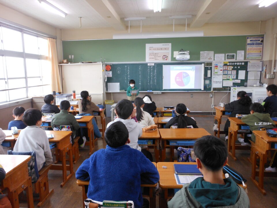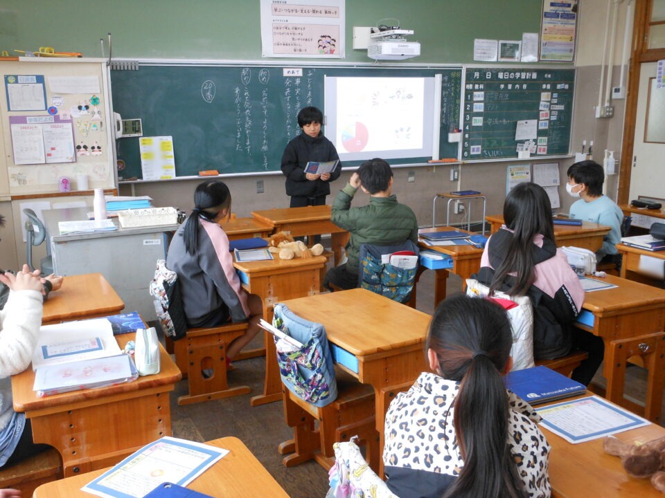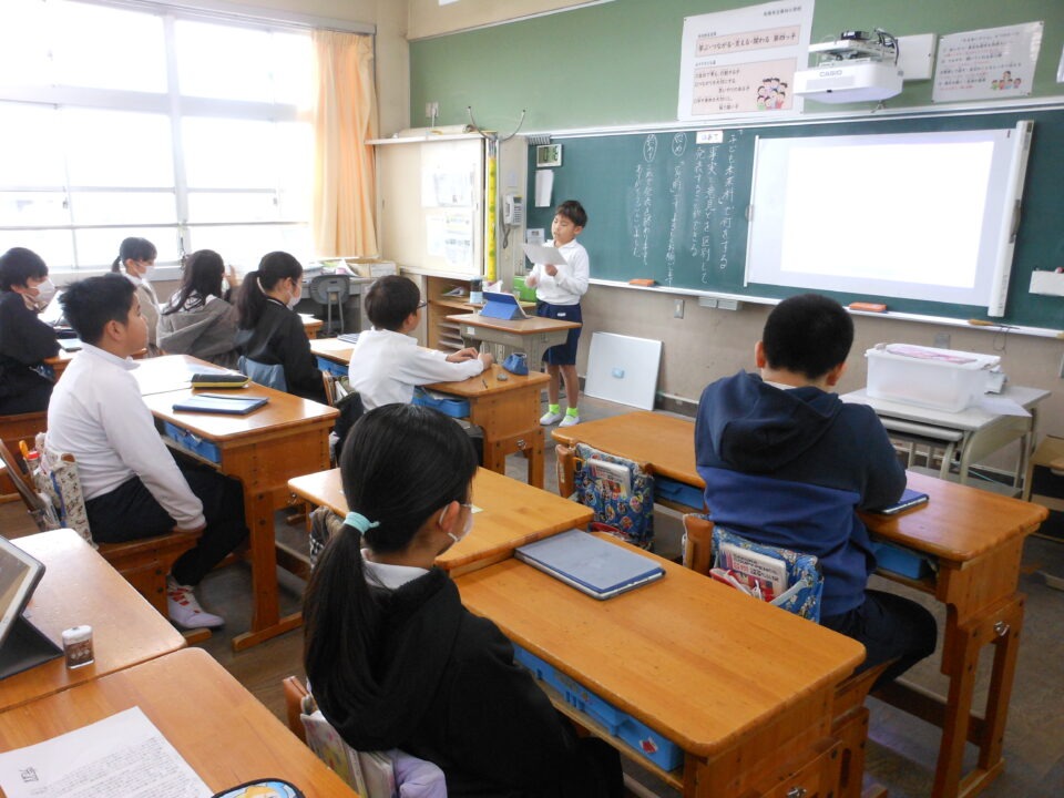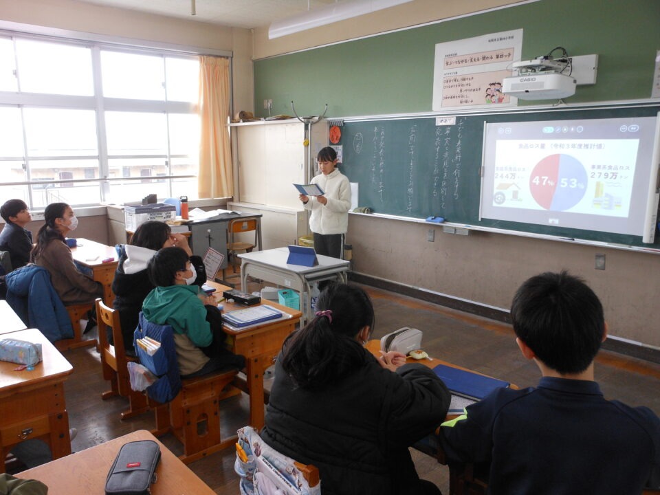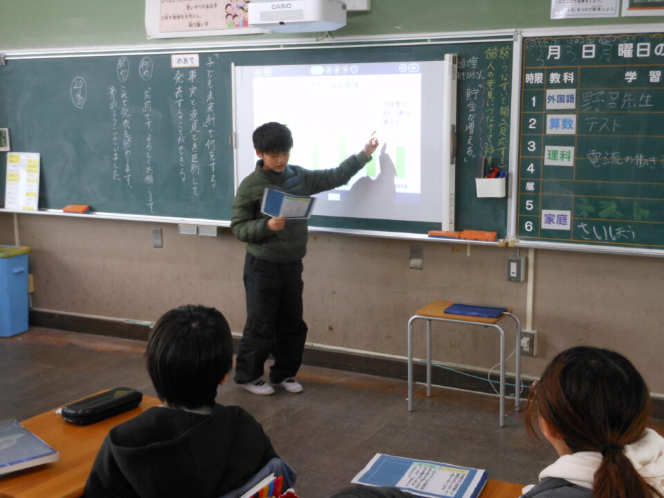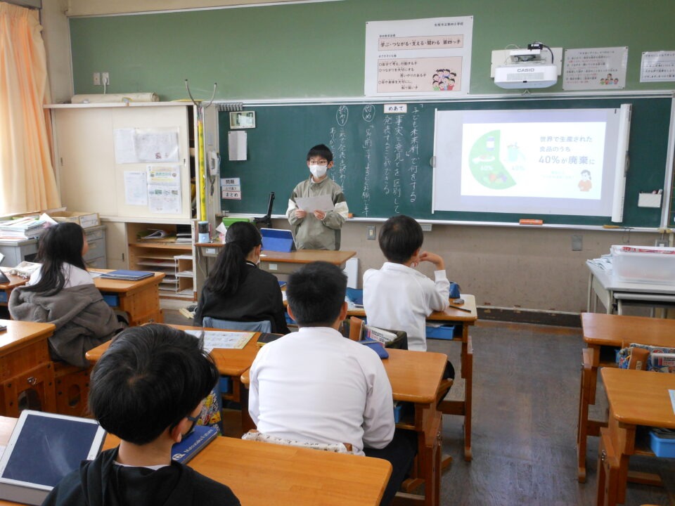 今日は、今ある食品ロスや地球温暖化、海洋汚染など様々な課題に対して、未来を良くするためにどうすれば良いか、自分たちで調べたり考えたりしたことを一人ずつ発表し合いました。