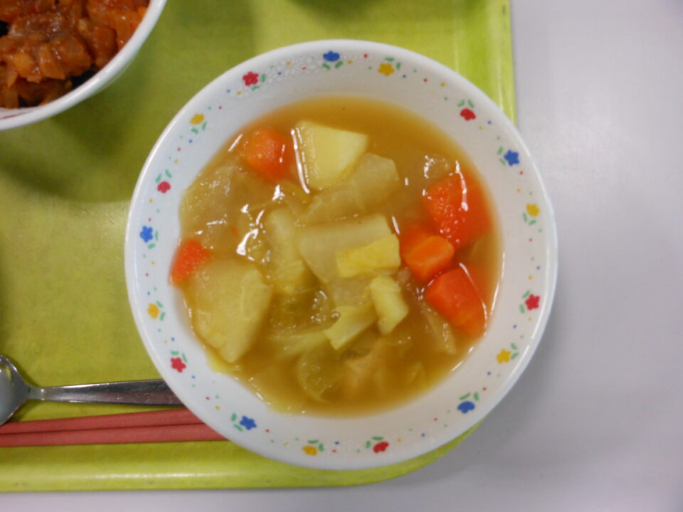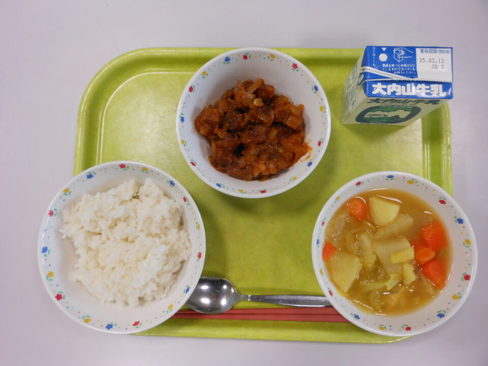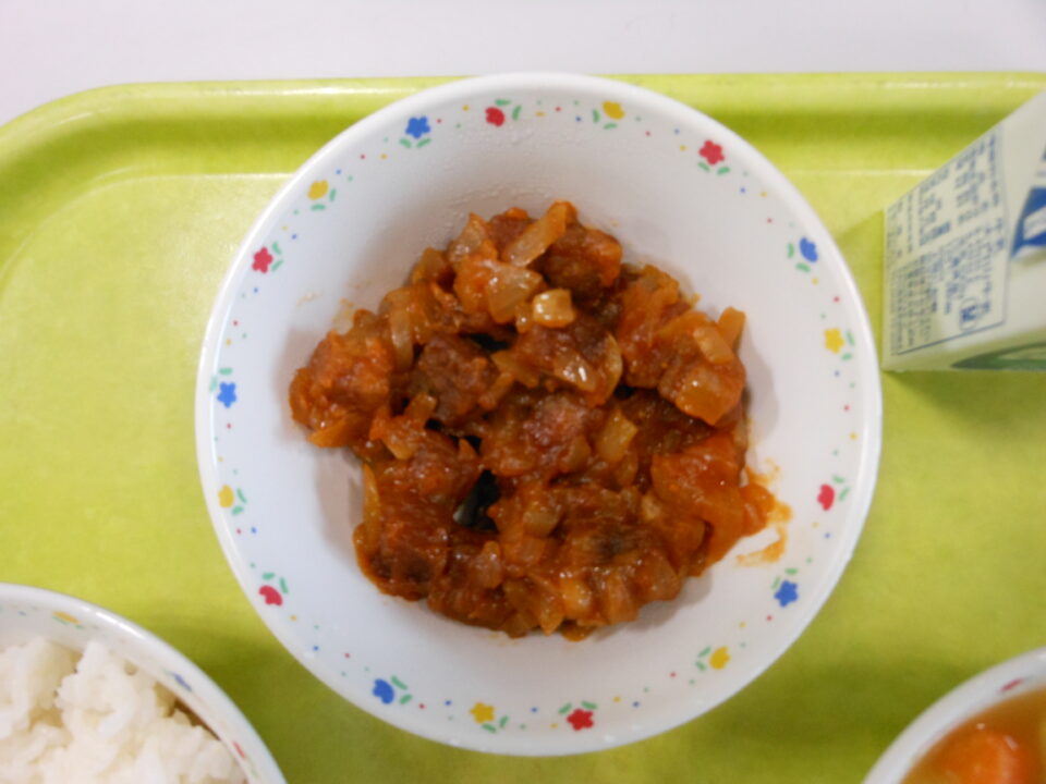 今日の給食は、ご飯(麦入り)、牛乳、まぐろのオニオンソース、カレーポトフでした。