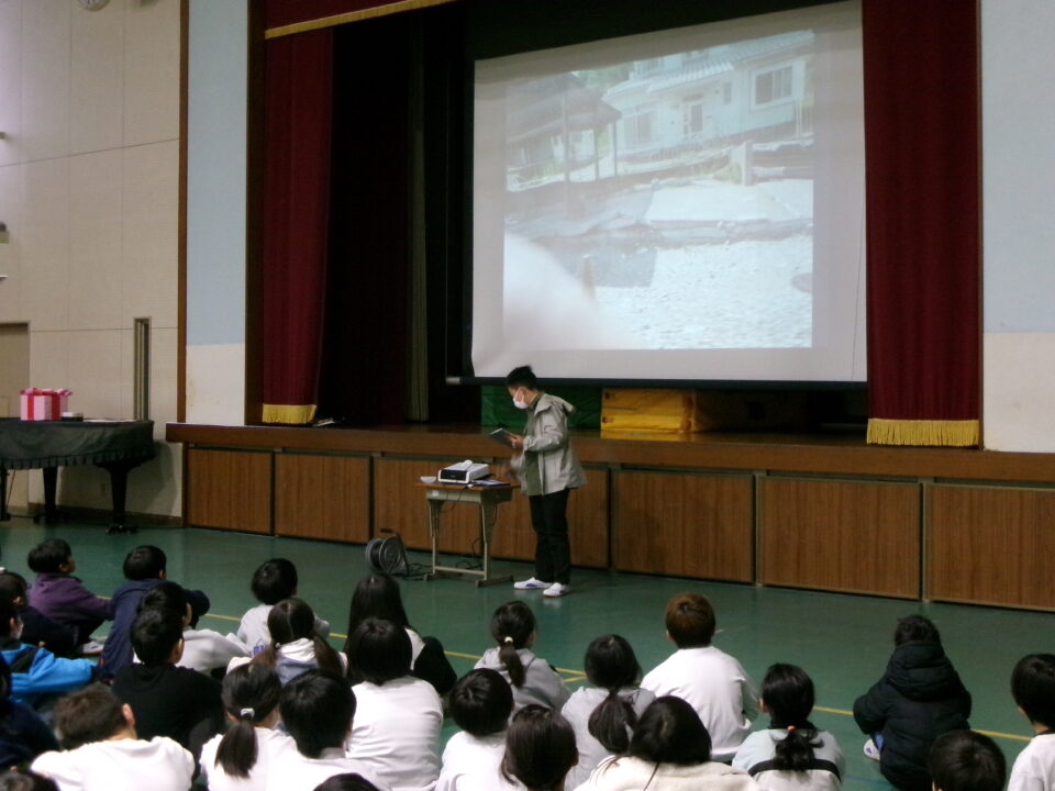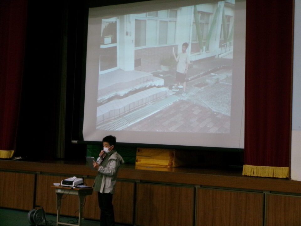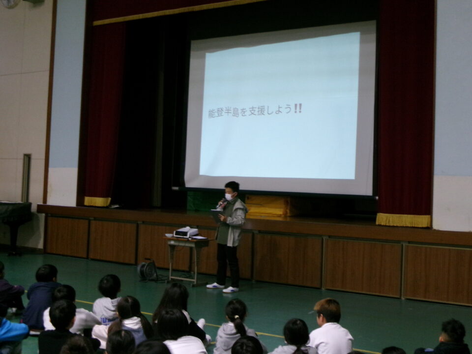 次に能登半島地震について、夏に現地を訪れ感じたこと、考えたことを6年生の子がみんなに伝えました。