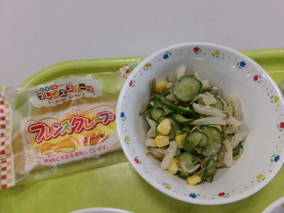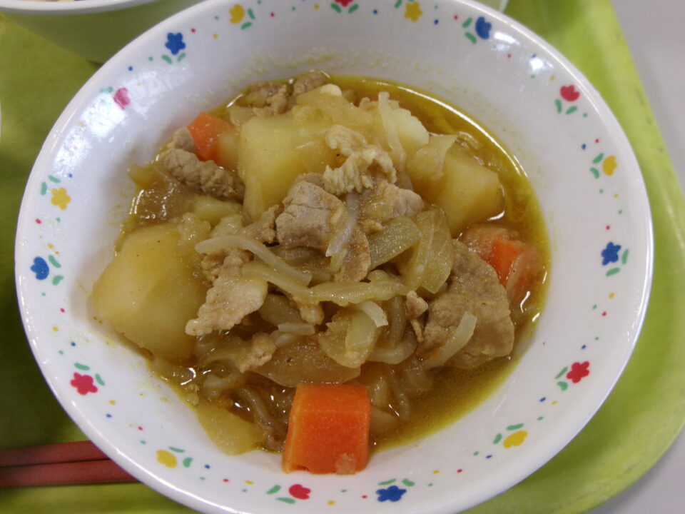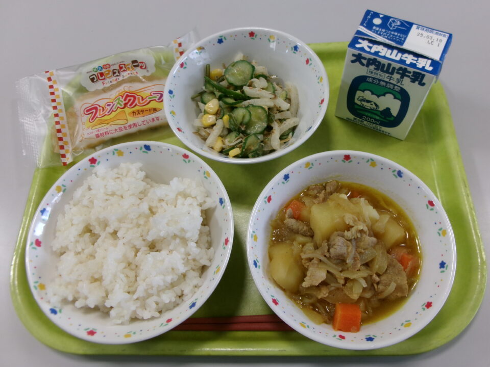 今日の給食は、ご飯(麦入り)、牛乳、肉じゃがカレー風味、大根と小魚のサラダでした。