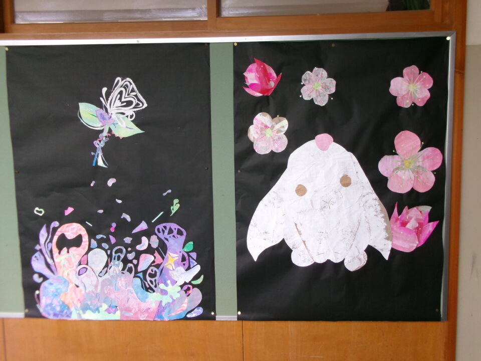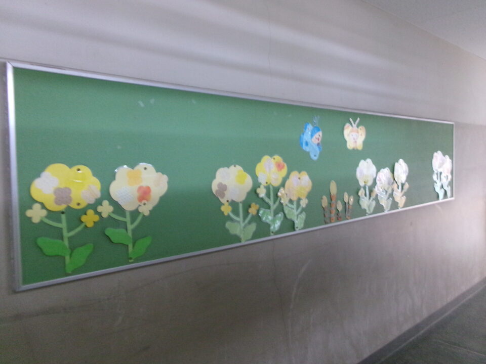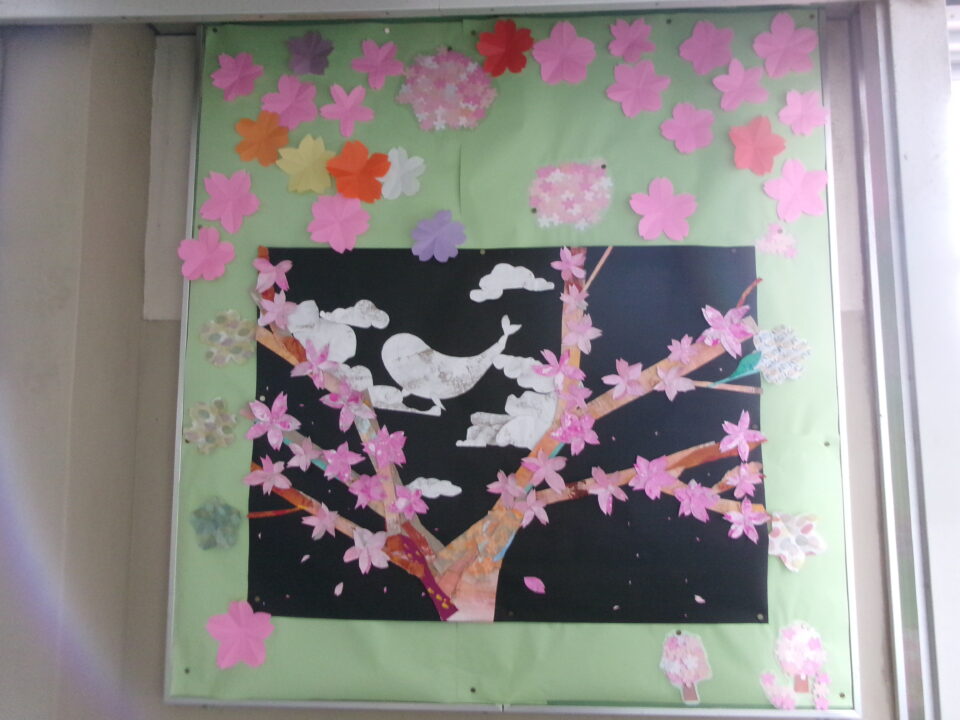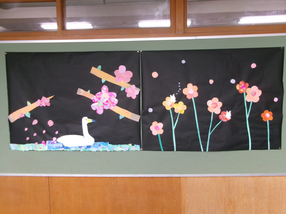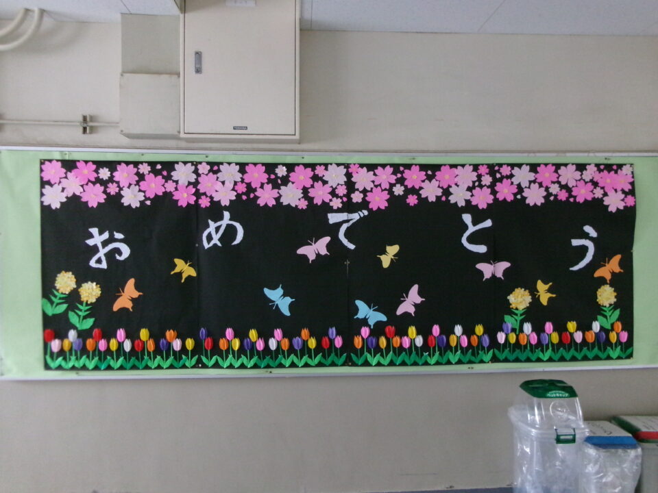 校内の掲示板には、各学年等の作品や学習、お知らせなどが掲示されていますが、3月、4月は、6年生が卒業、1年生~5年生は進級するので、地域の方々がお祝いを表した掲示物を作ってくれました。