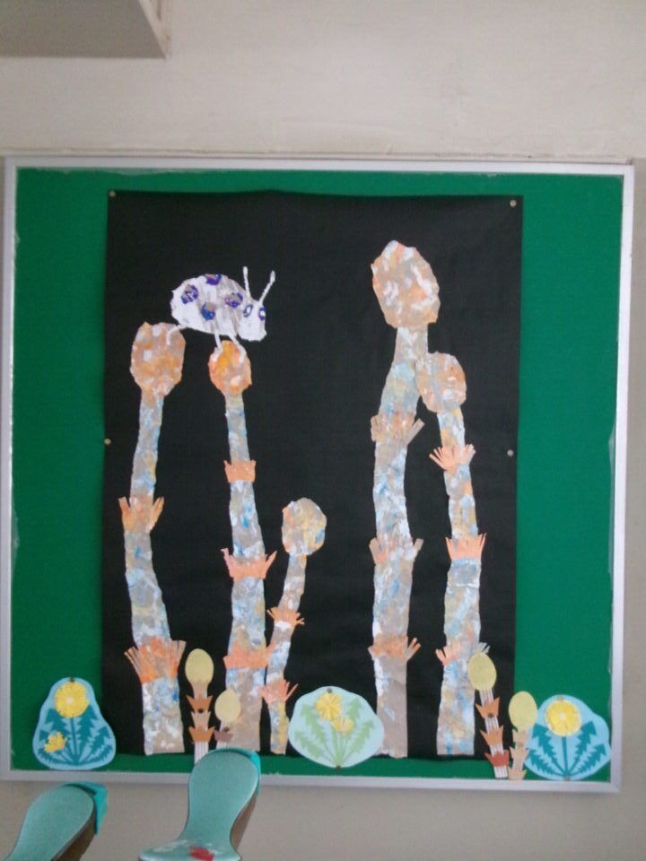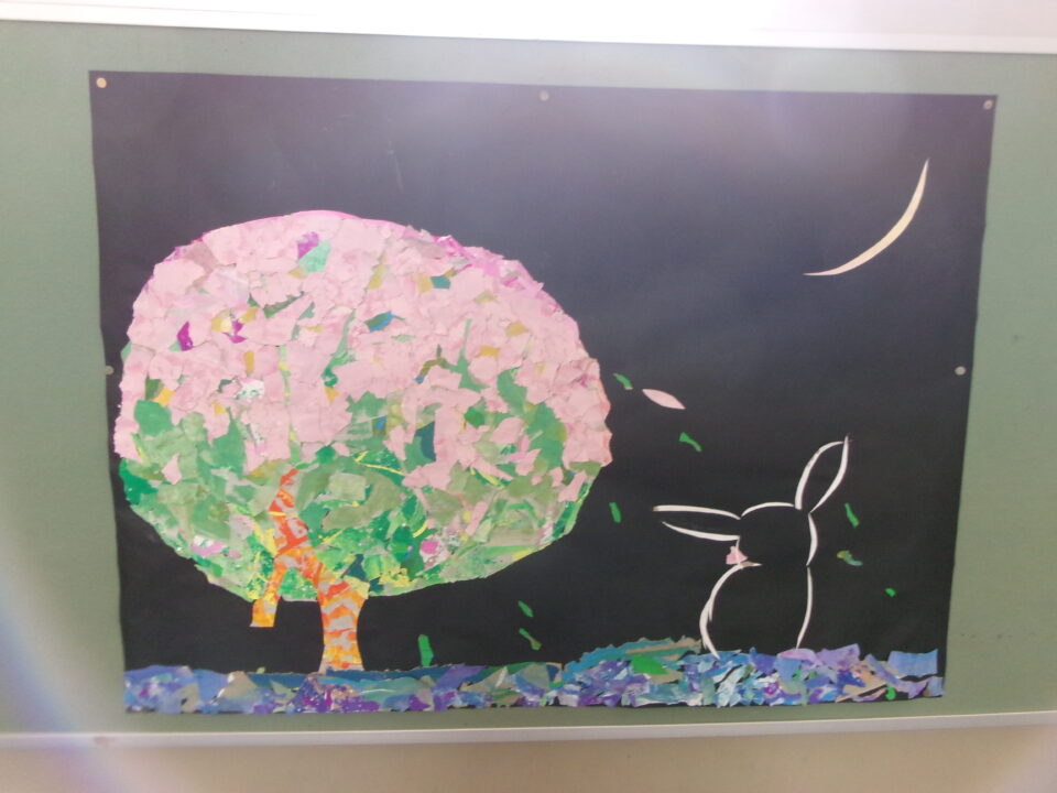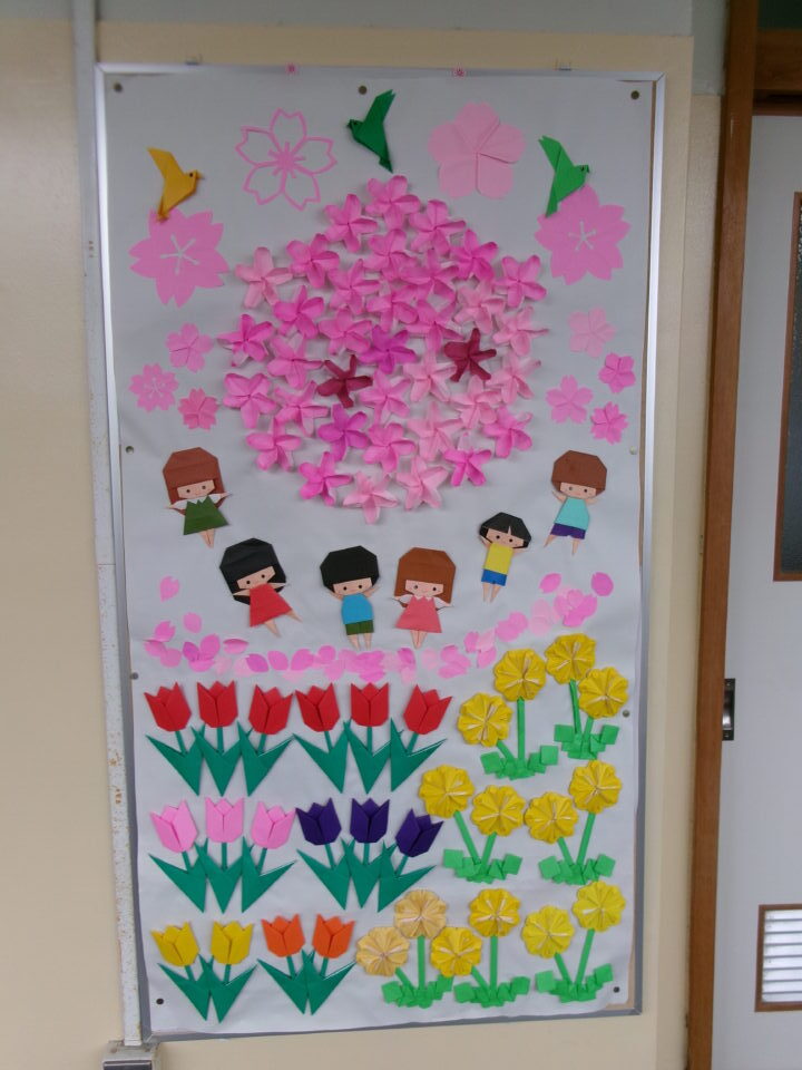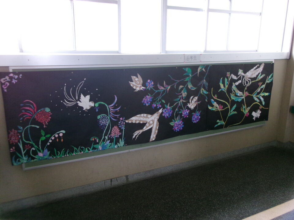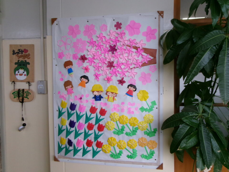 校内の掲示板には、各学年等の作品や学習、お知らせなどが掲示されていますが、3月、4月は、6年生が卒業、1年生~5年生は進級するので、地域の方々がお祝いを表した掲示物を作ってくれました。
