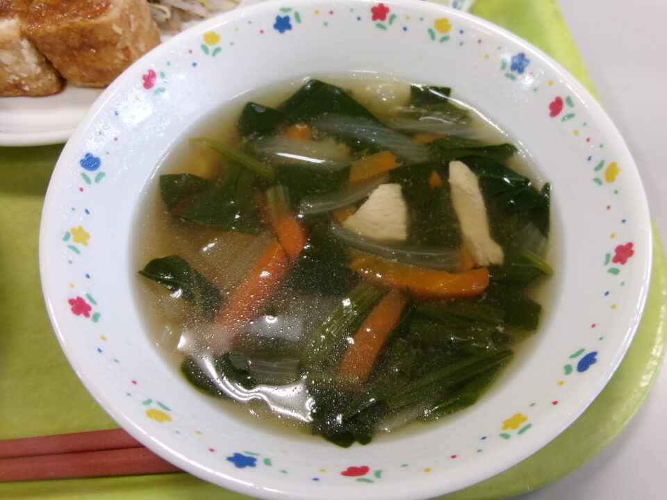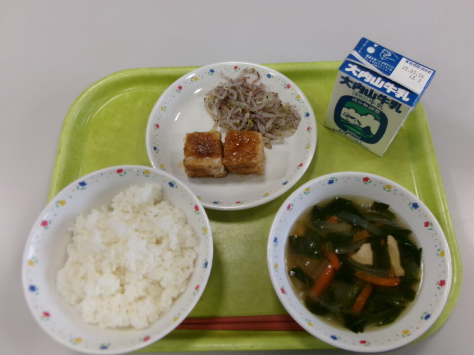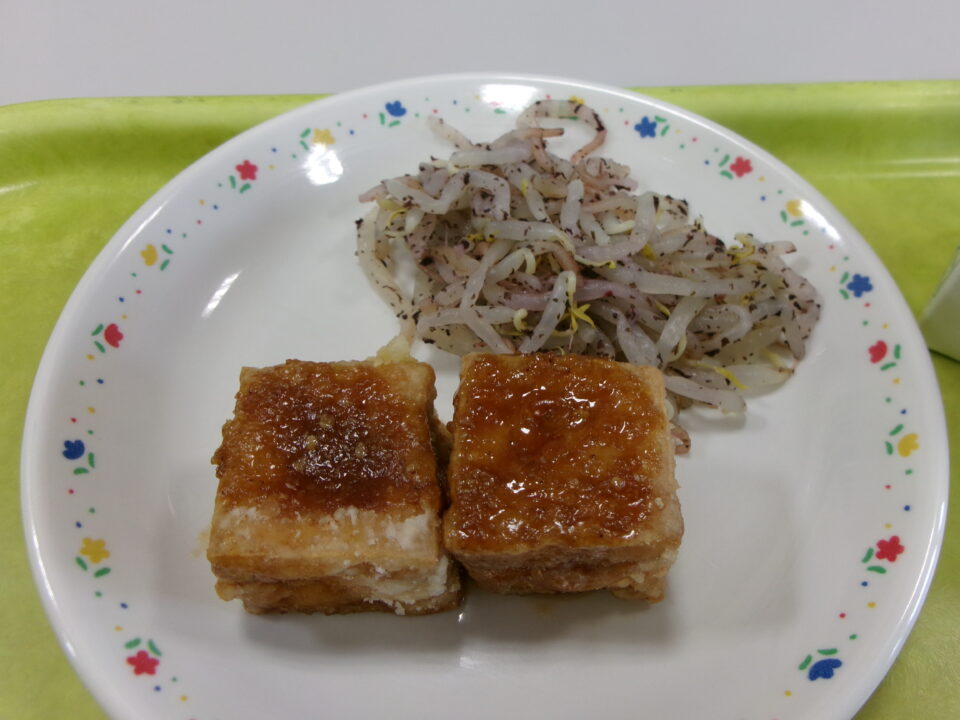 今日の給食は、ご飯、牛乳、厚揚げのごまだれがけ、もやしのしそ和え、とり肉とほうれん草の和風スープでした。