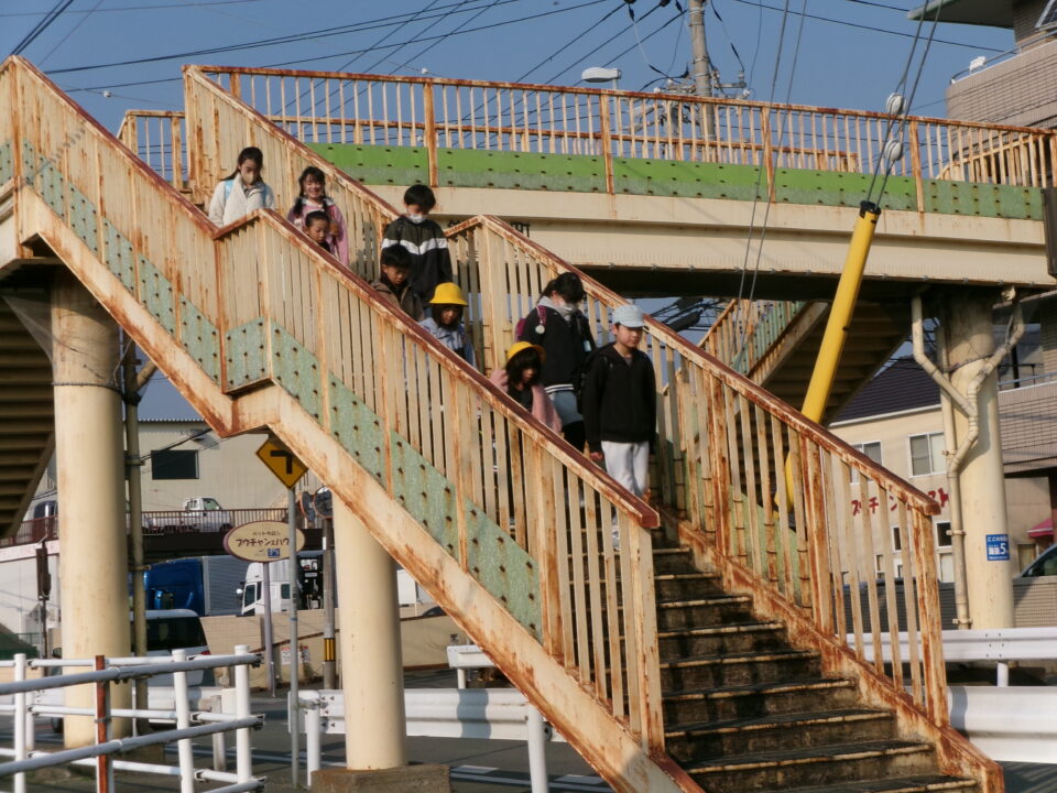 歩道橋を降りるのに、階段があるので1年生の子にとってはすたすたと降りることができません。