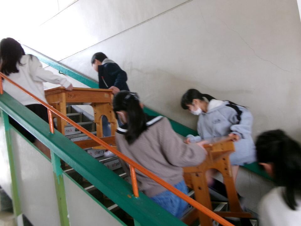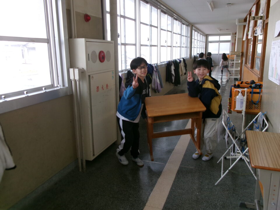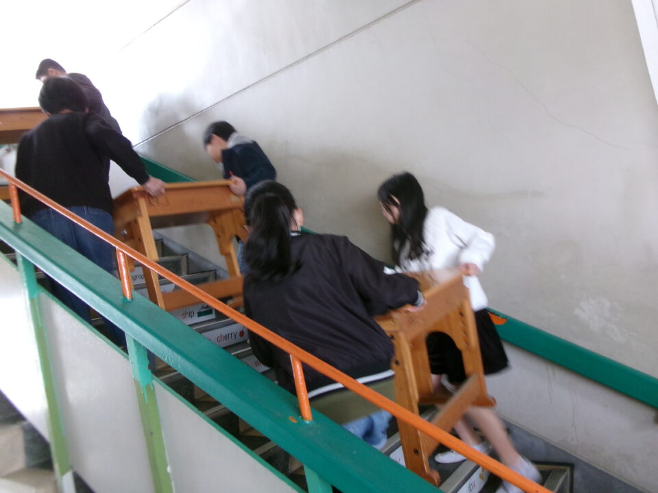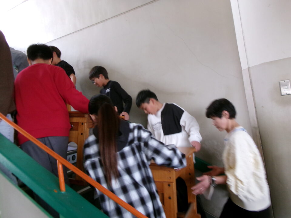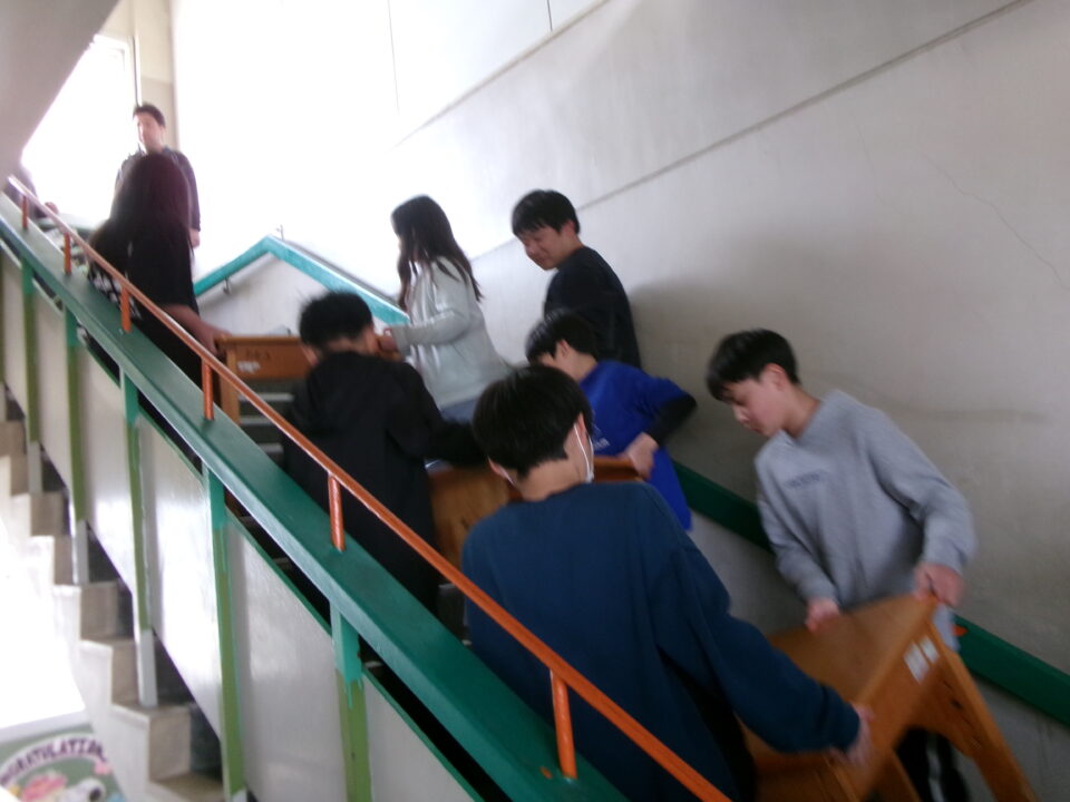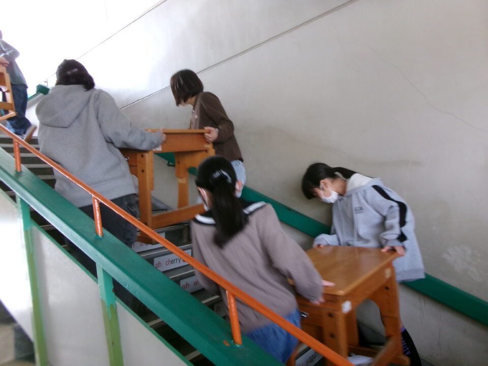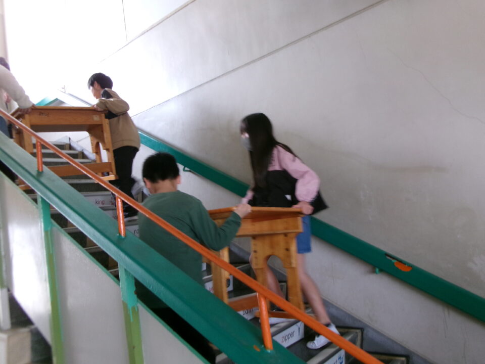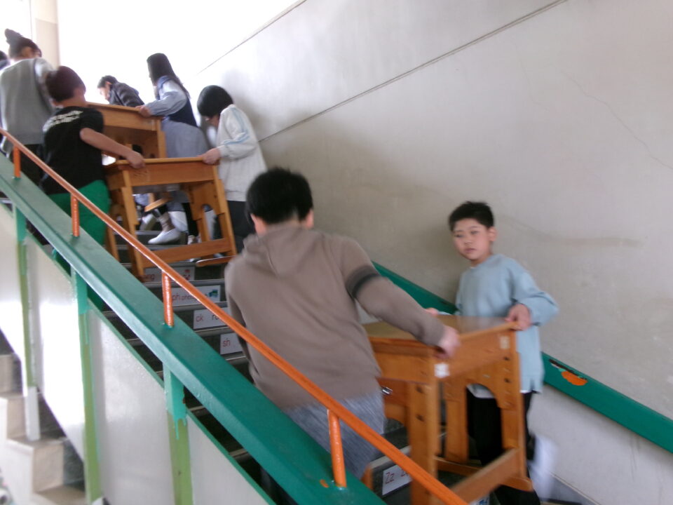 3年生の机を今日のうちに5年生のお兄さん、お姉さんに手伝ってもらい、2階から3階へ運びました。