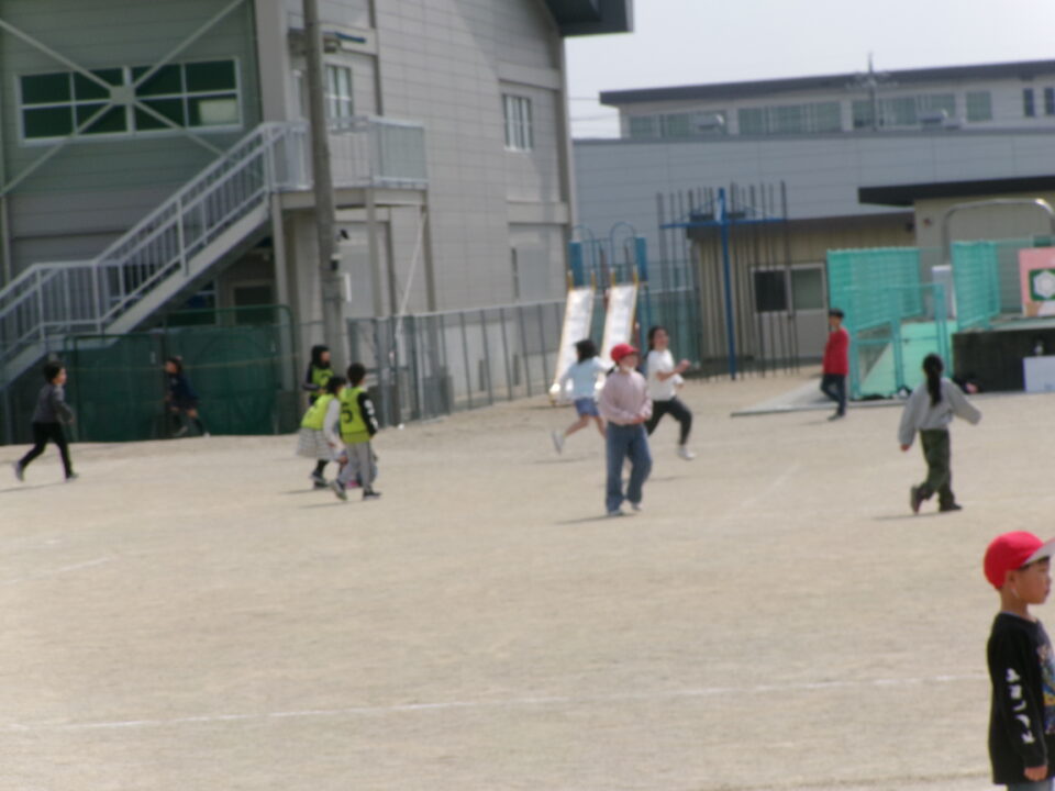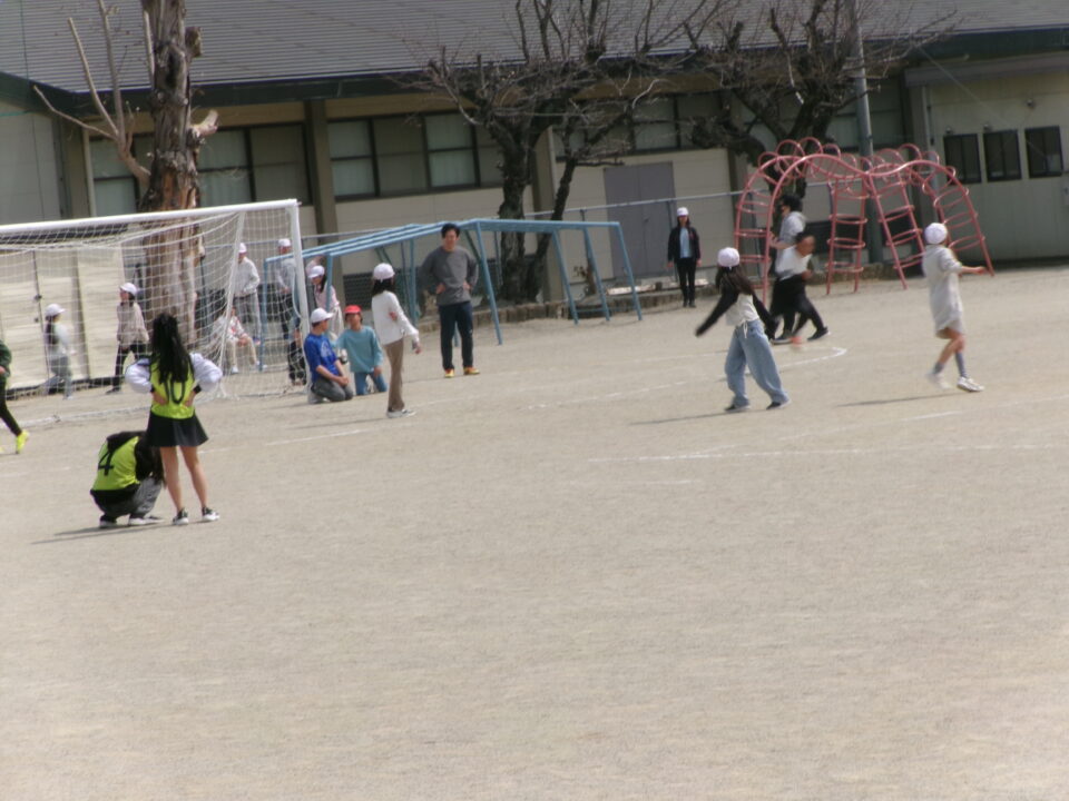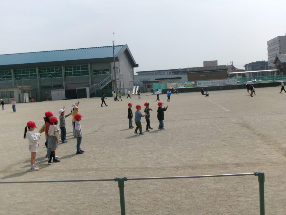 今からまさに運動場へ出て、レクをしに行くところでした。