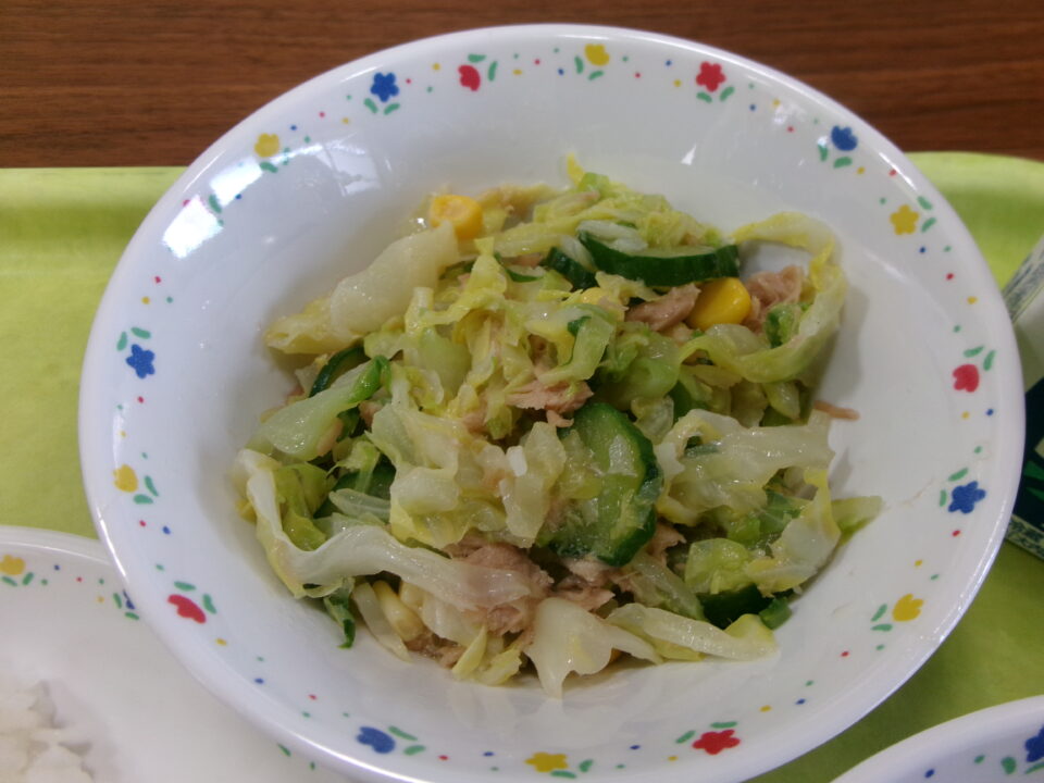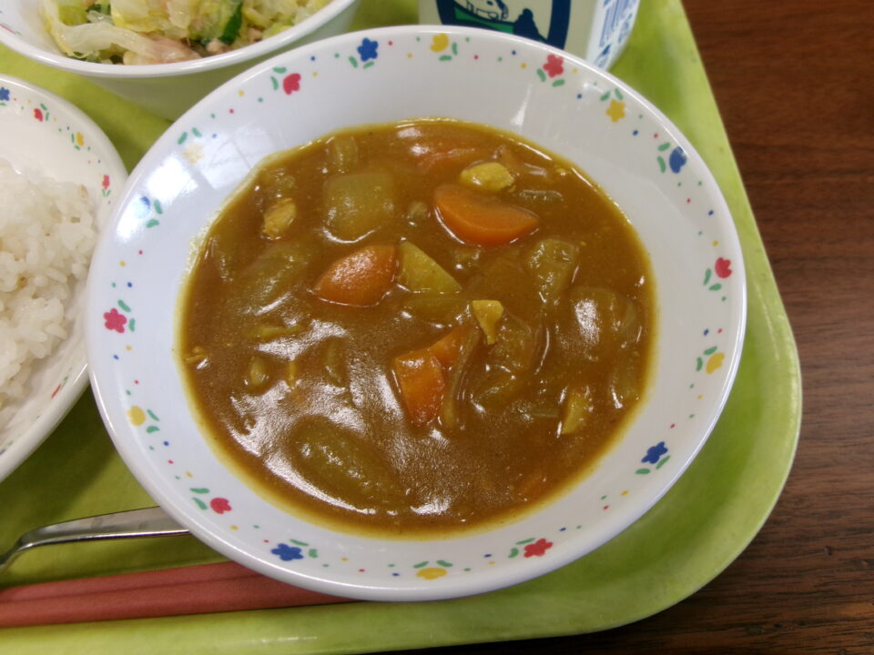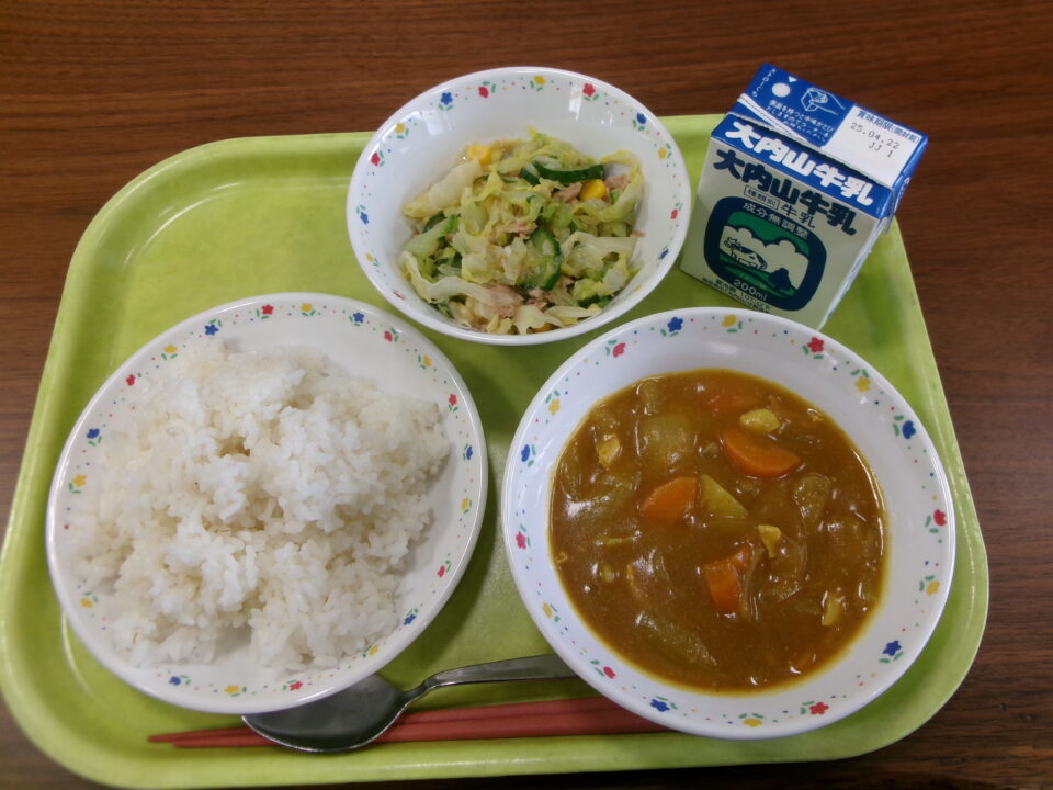 今日きょうのメニューは、ごはん麦入むぎいり)、チキンカレー、牛乳ぎゅうにゅうはるキャベツとツナのサラダでした。