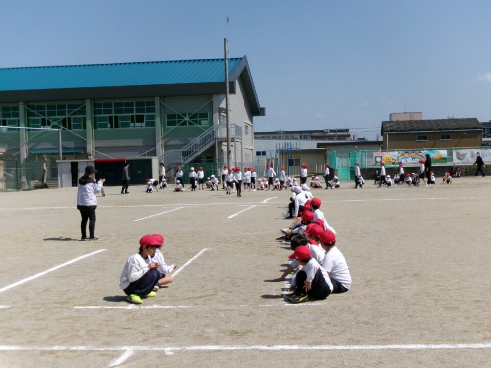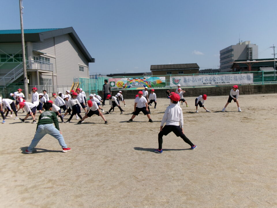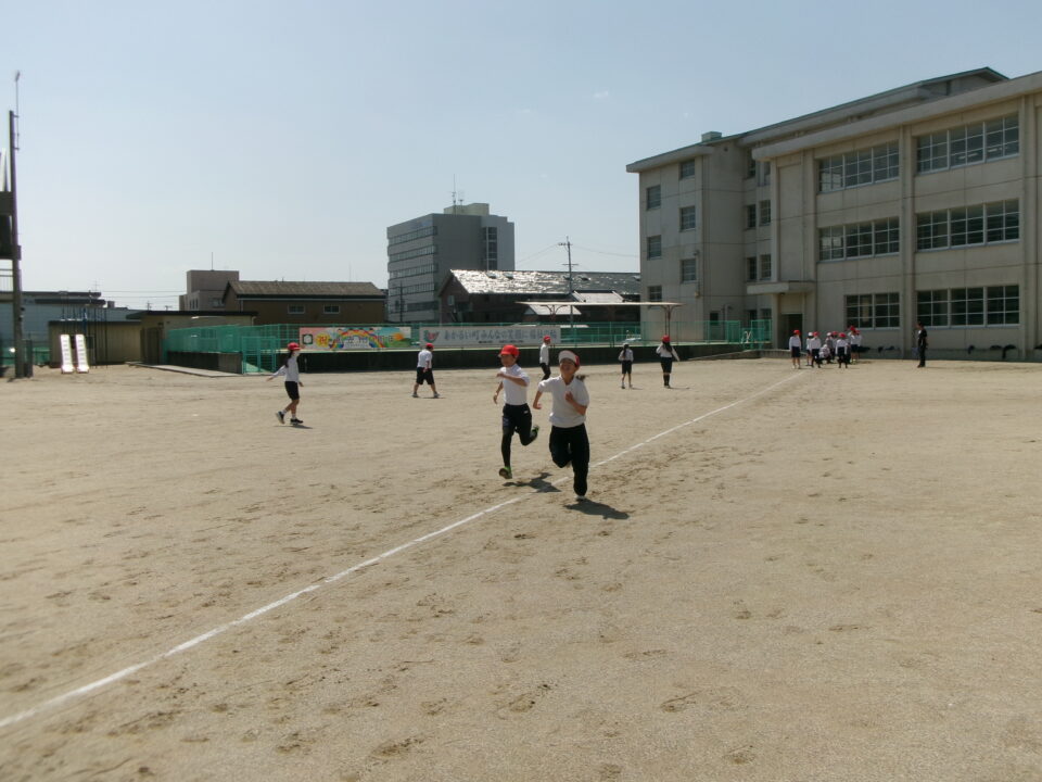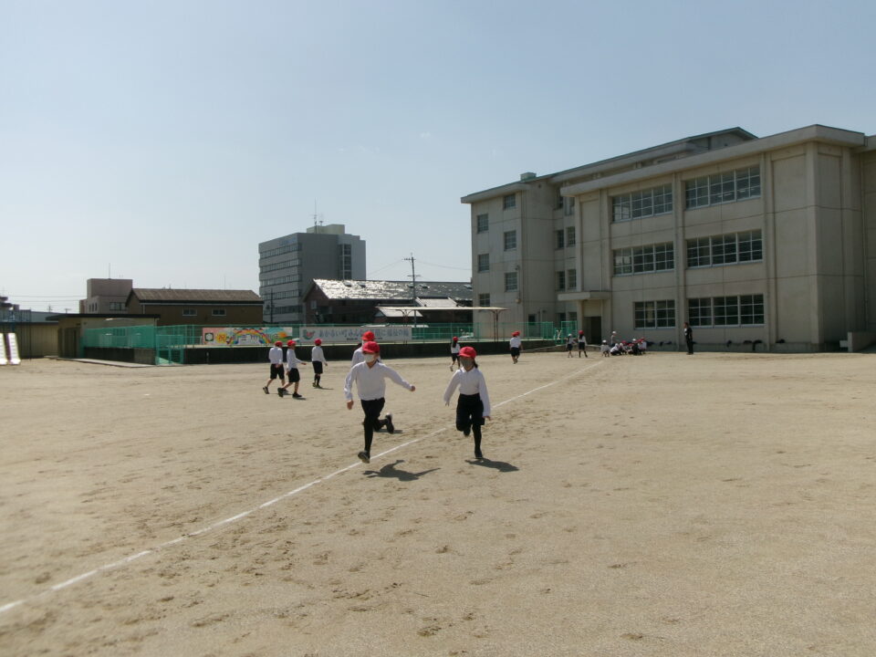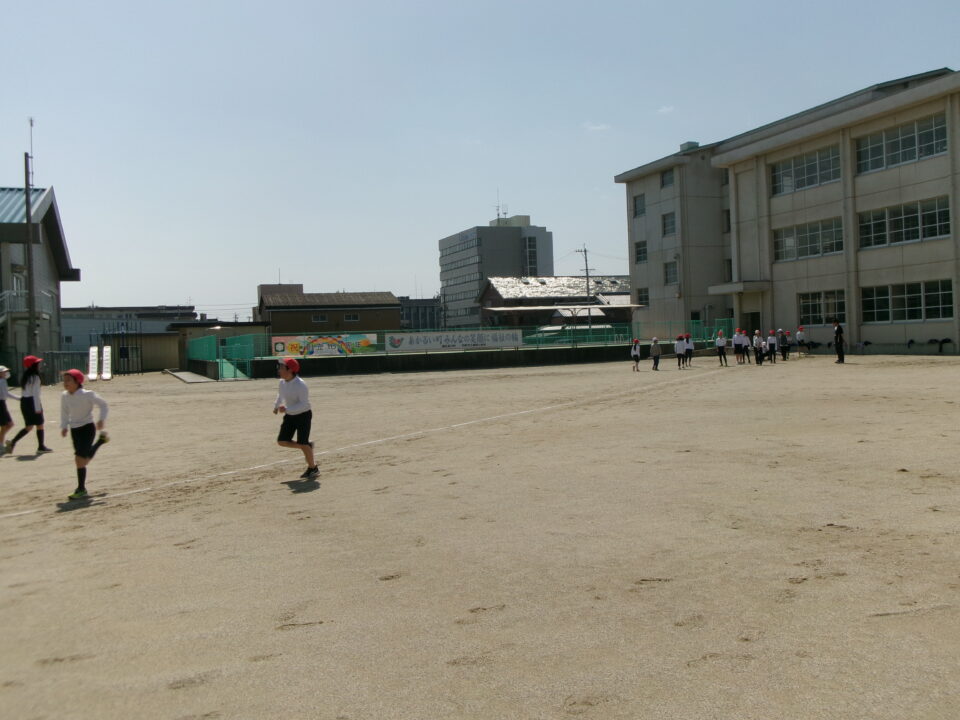 運動場では、新体力テストもあるので50mの走力を計っています。全速力で走ったので、整理運動もしっかりしました。
