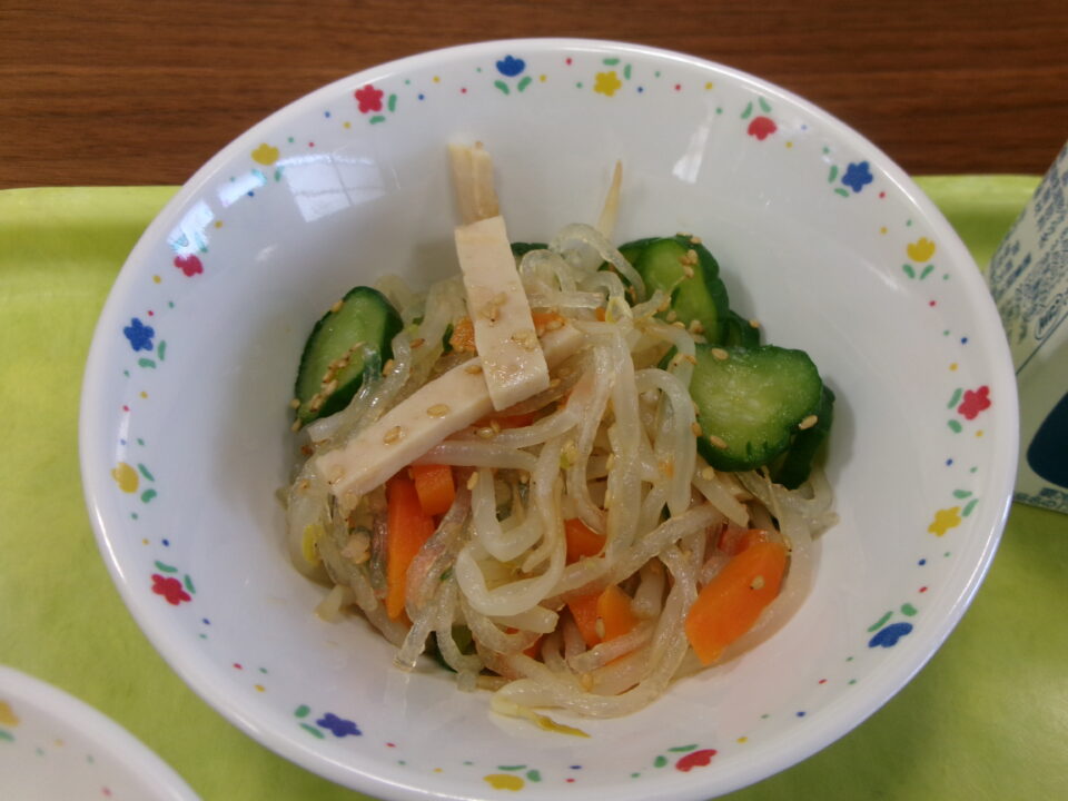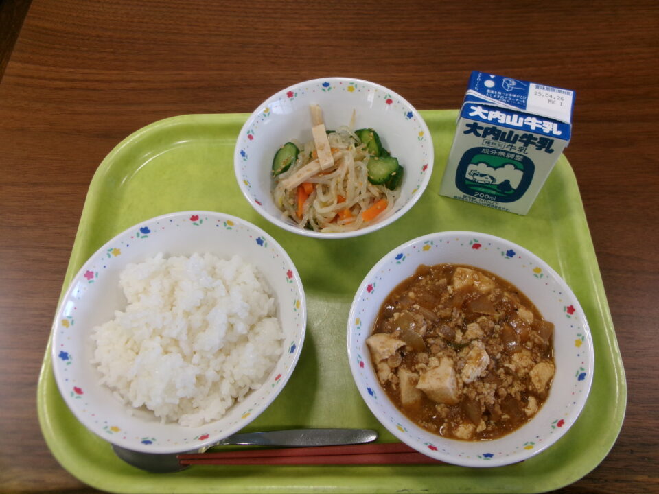 今日の給食は、ご飯、牛乳、マーボー豆腐、バンサンスーでした。