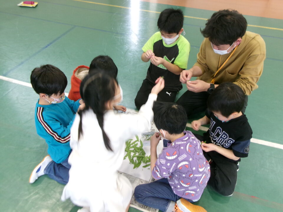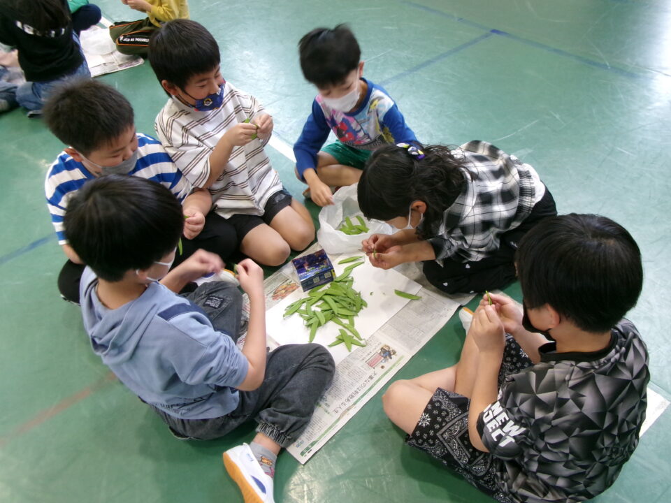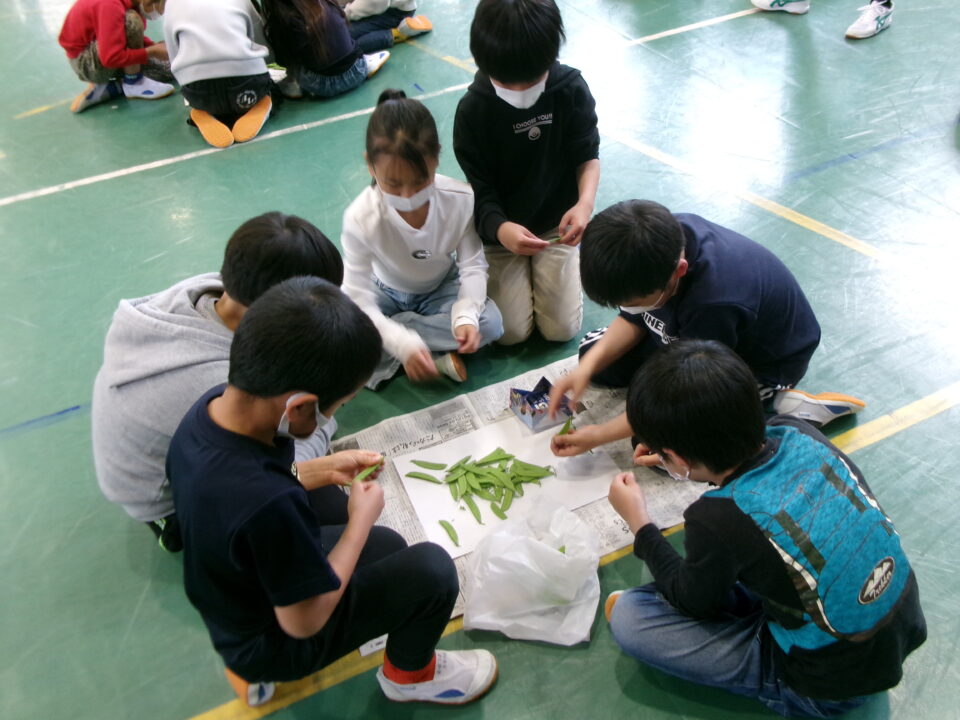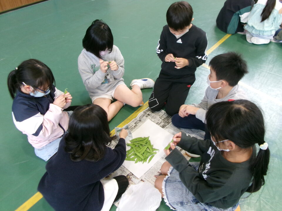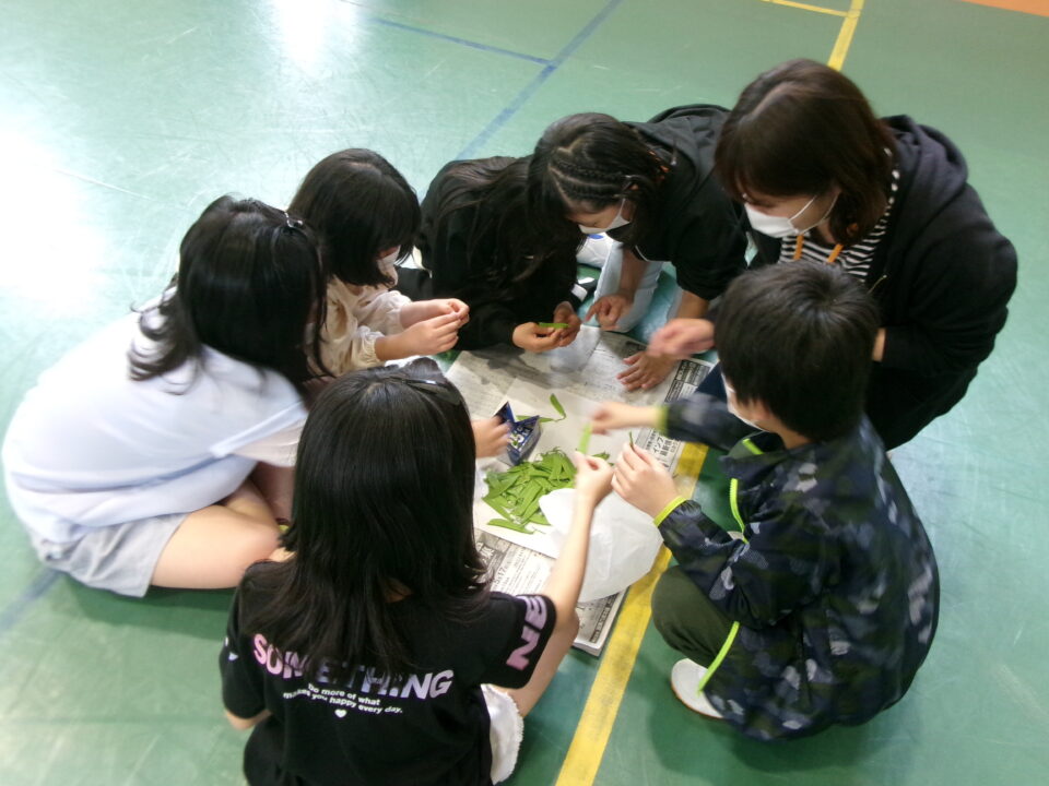 3年生の子たちには、さやえんどうのすじを取ってもらいました。お家でしたことがある子もいましたね。