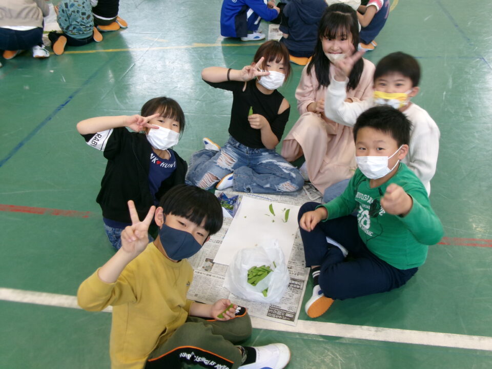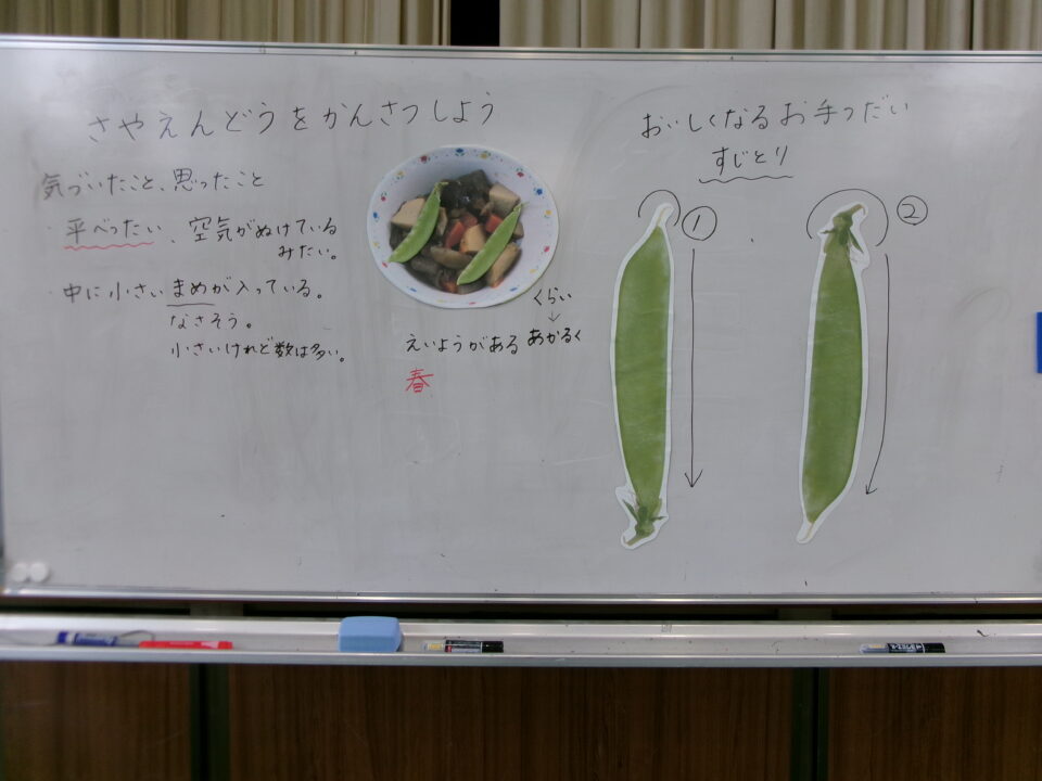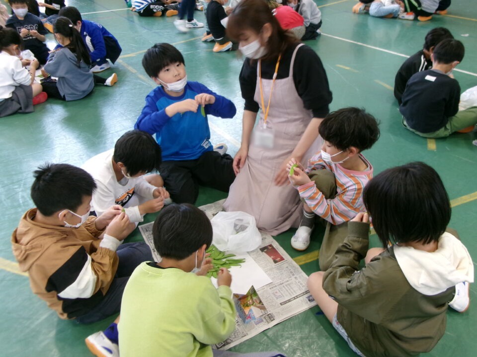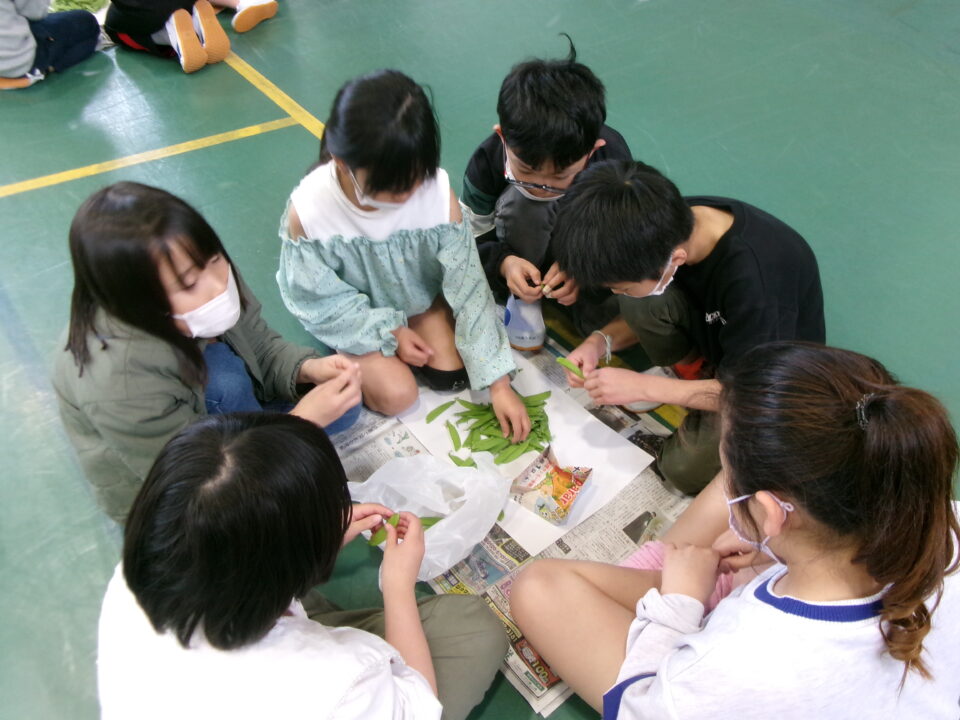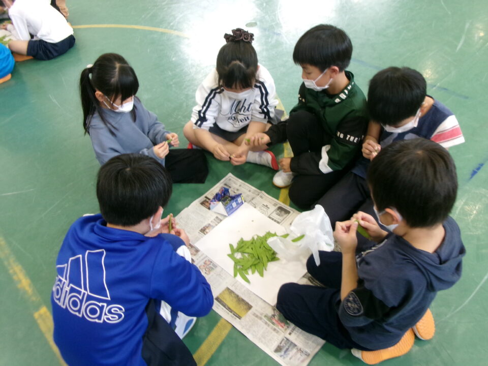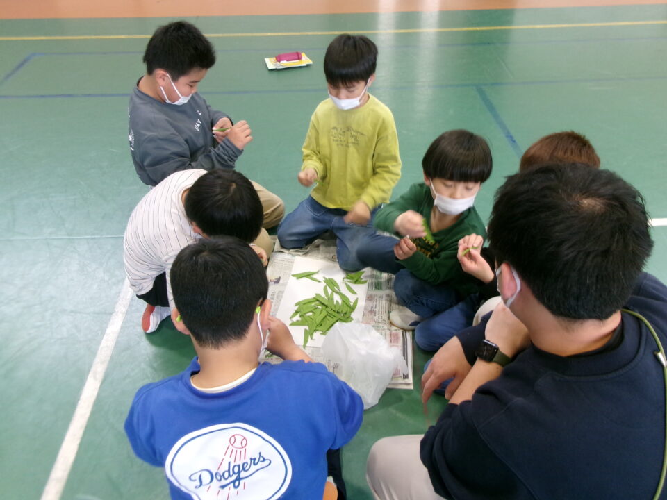 3年生の子たちには、さやえんどうのすじを取ってもらいました。お家でしたことがある子もいましたね。