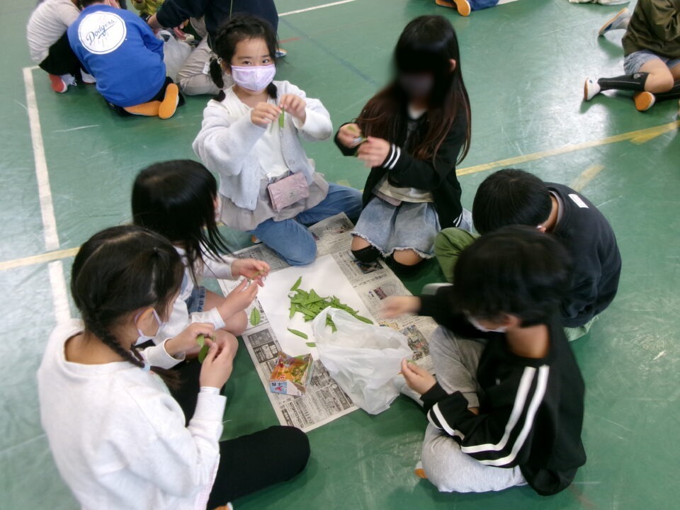 3年生の子たちには、さやえんどうのすじを取ってもらいました。お家でしたことがある子もいましたね。