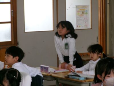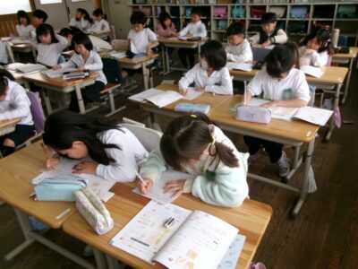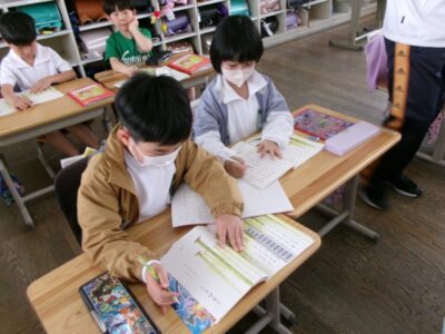 国語の教科書に書かれている言葉から読み取りをしていました。算数では、2桁のたし算をひっ算で計算する練習をしていました。