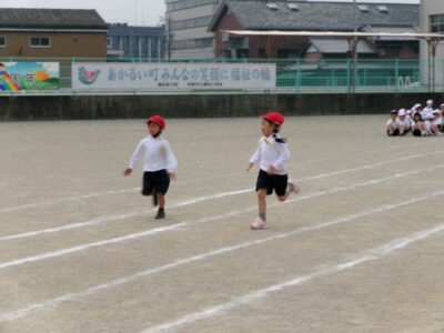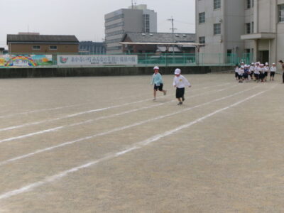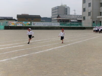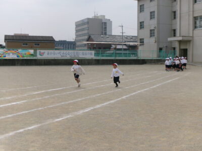 運動場では、1年生の子たちが50m走をしていました。50mの直線を全速力で走り、タイムを計測します。