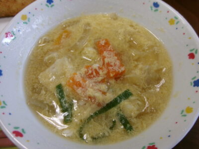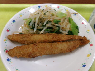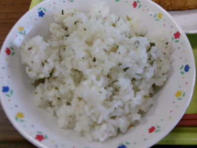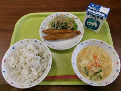 今日の給食は、菜飯(麦入り)、牛乳、ししゃもフライ、チンゲンサイのおかか和え、かきたま汁でした。