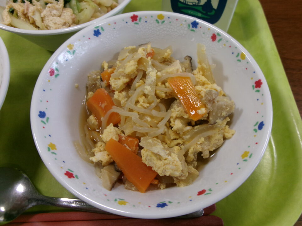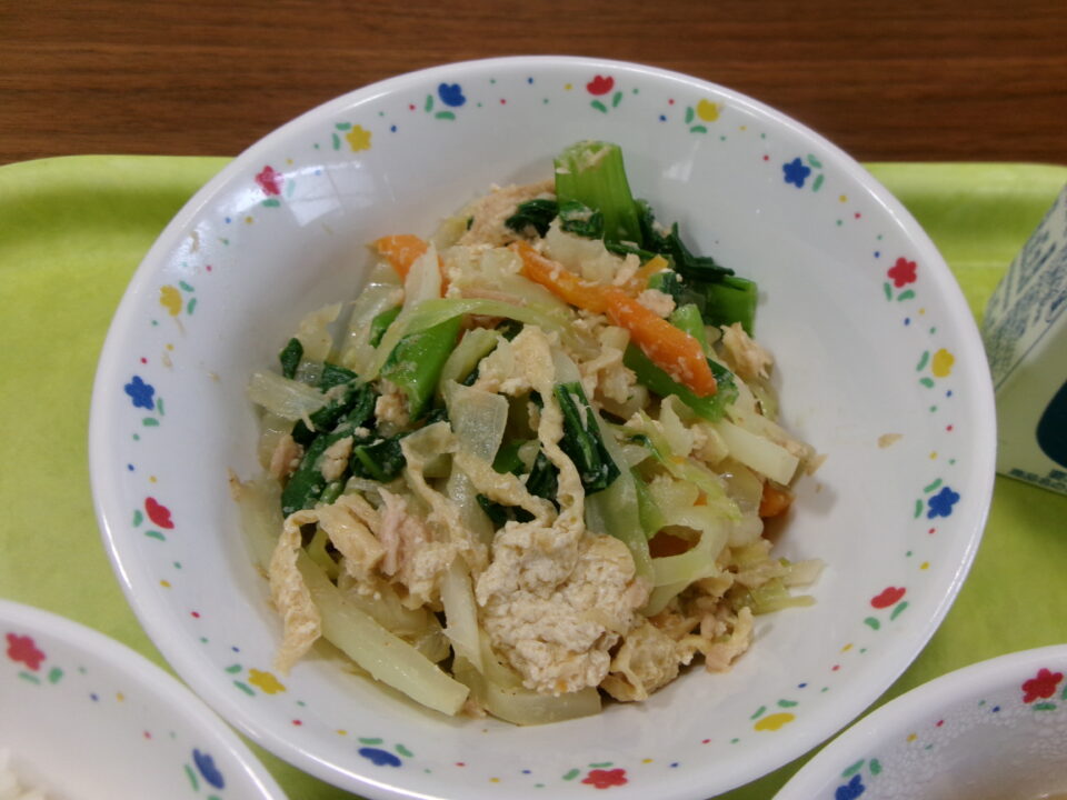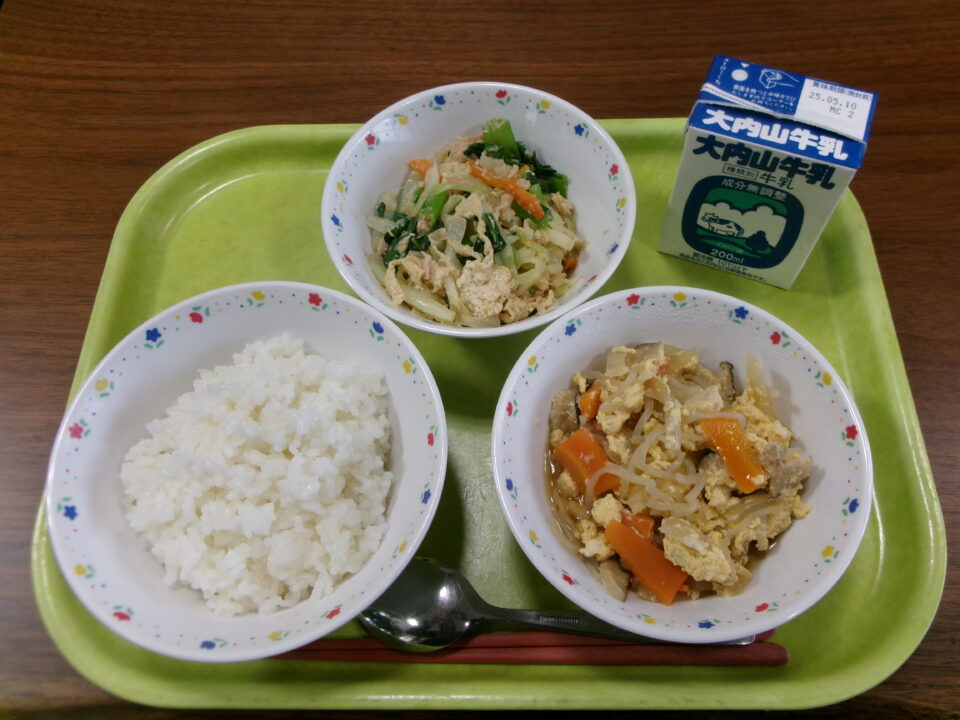 ご飯、親子煮、牛乳、小松菜と油揚げの和え物でした。親子煮の卵が松阪産でしたよ。