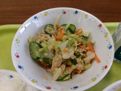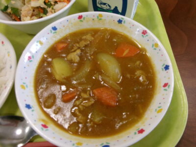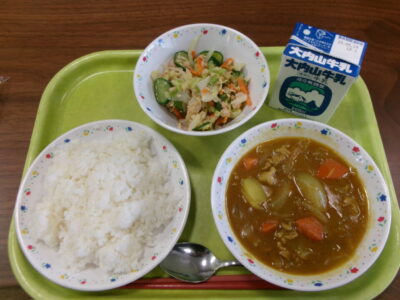 今日の給食は、ご飯、ポークカレー、牛乳、ツナとキャベツのレモン和えでした。