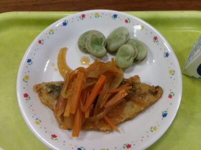 昨日、1年生の子たちがそらまめをさやから出すお手伝いをしましたね。