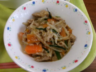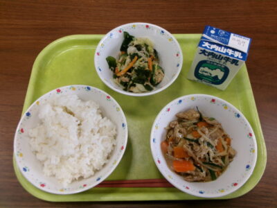 今日の給食は、ご飯(麦入り)、牛乳、プルコギ、チョレギサラダでした。