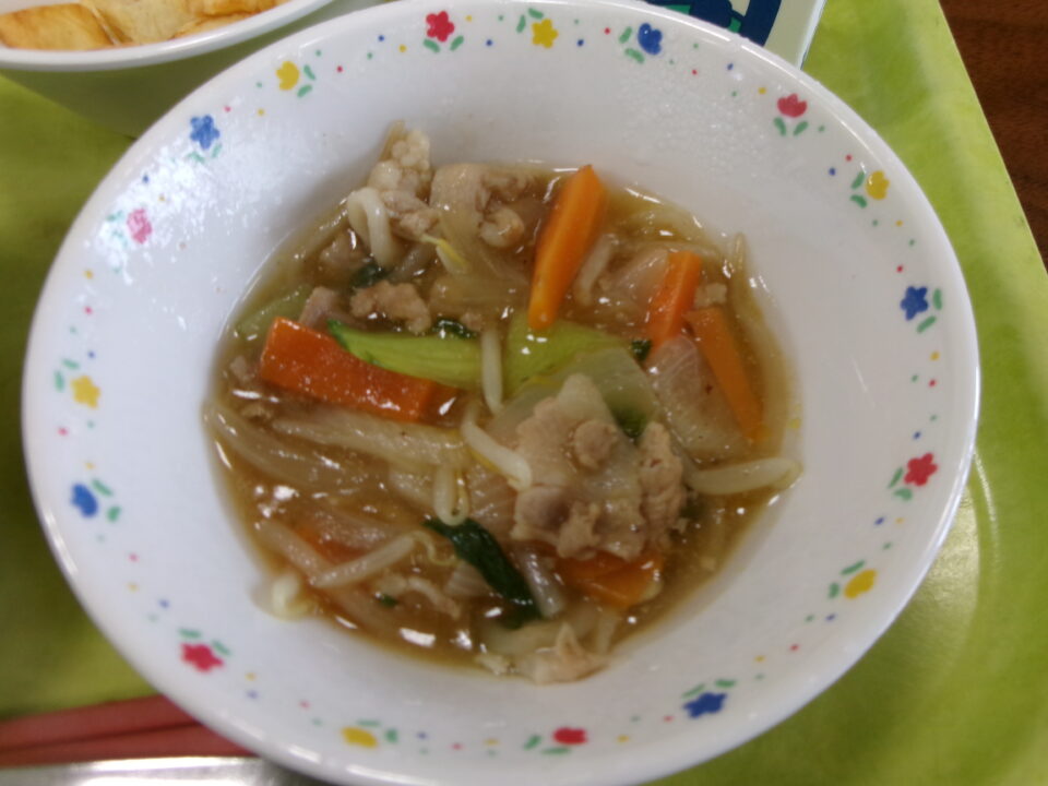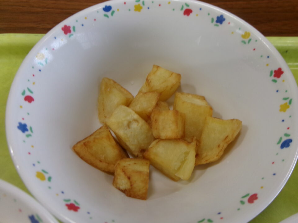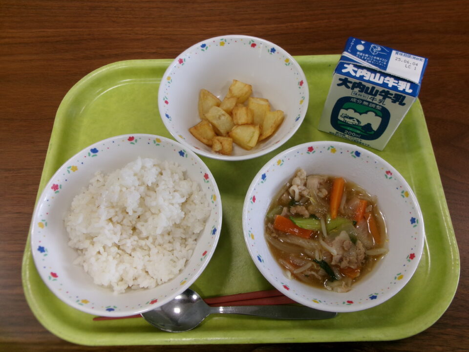 今日きょう給食きゅうしょくは、ごはん麦入むぎいり)、中華ちゅうかあん、牛乳ぎゅうにゅうしんじゃがのコロコロポテトでした。