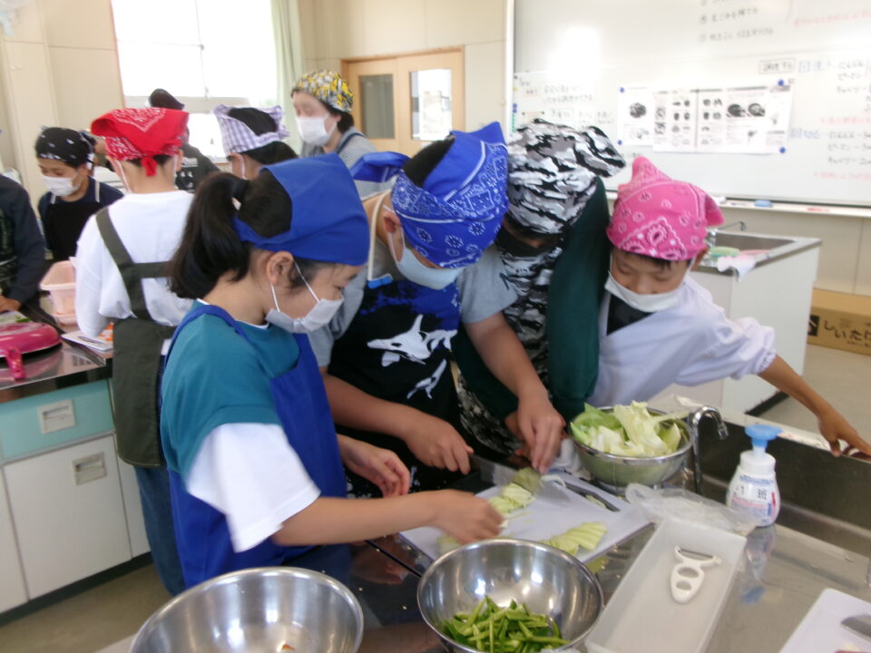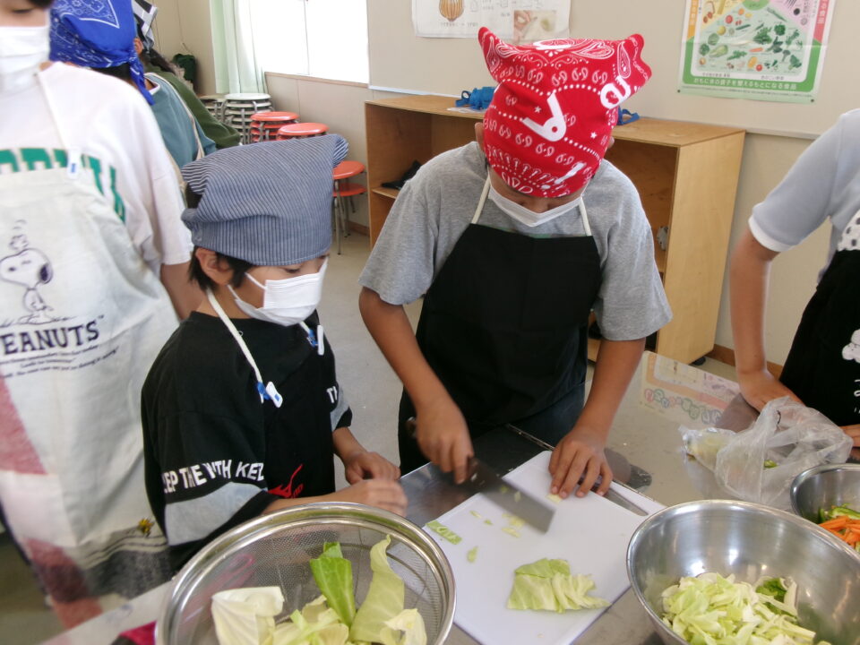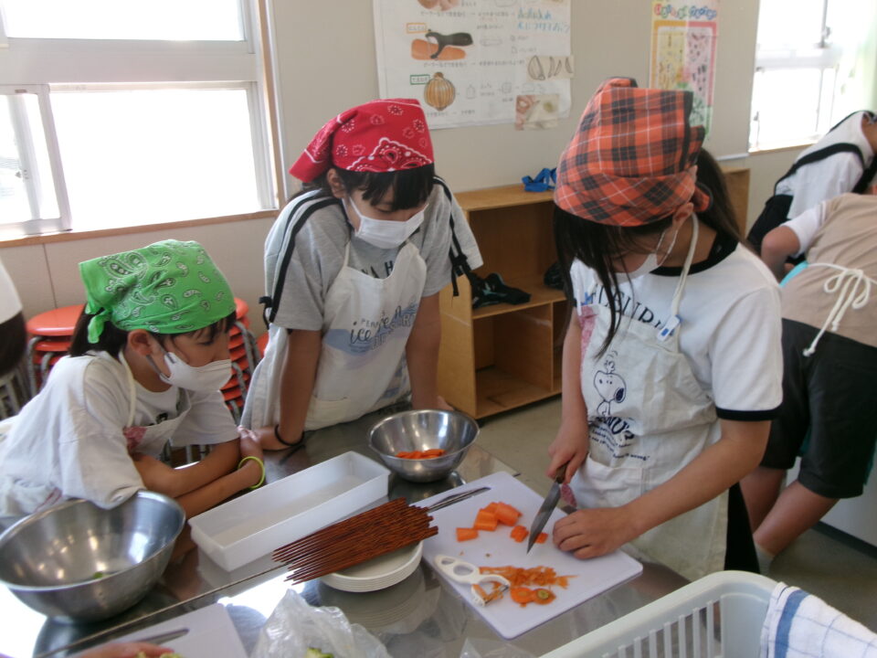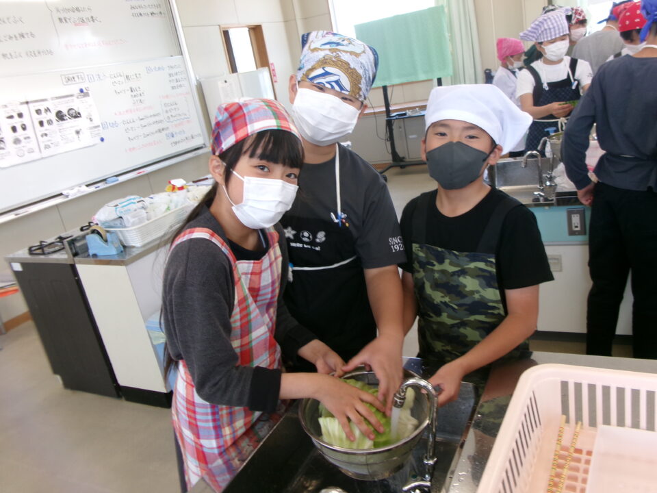 野菜やさいかかりを1独占どくせんするのではなく、みんなができるように交代こうたいしたり、あらものづいてするひとがいたり、包丁ほうちょうがまないたうえいてあり、使つかっていないときにかごにもどひとがいたり、すばらしい行動こうどうられる6年生ねんせいでした。