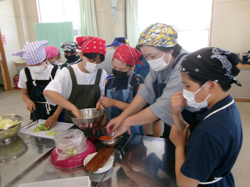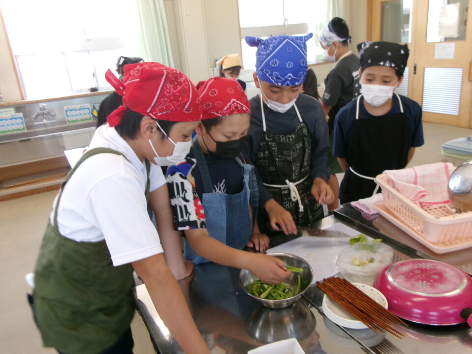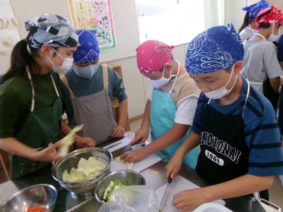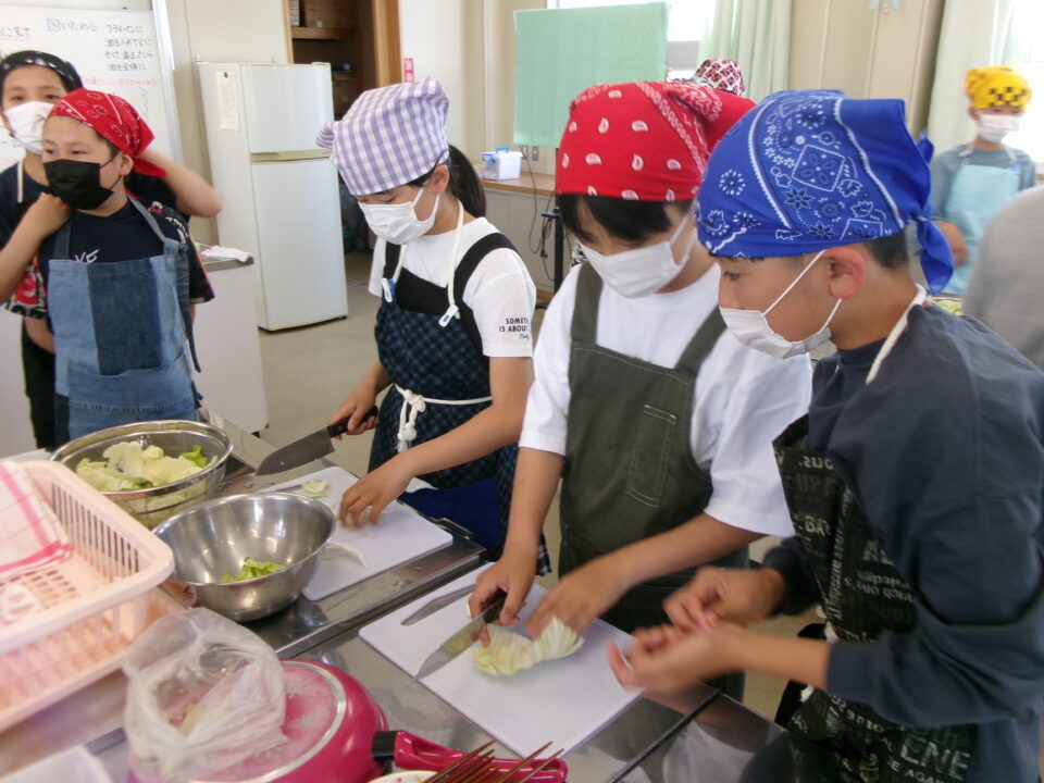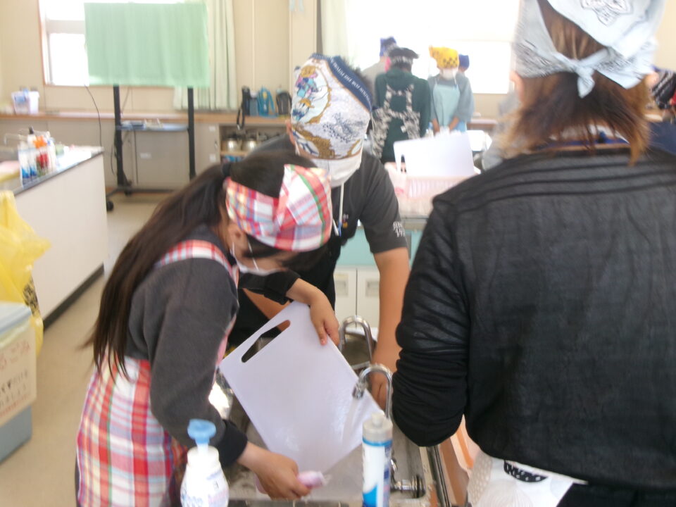 野菜やさいかかりを1独占どくせんするのではなく、みんなができるように交代こうたいしたり、あらものづいてするひとがいたり、包丁ほうちょうがまないたうえいてあり、使つかっていないときにかごにもどひとがいたり、すばらしい行動こうどうられる6年生ねんせいでした。