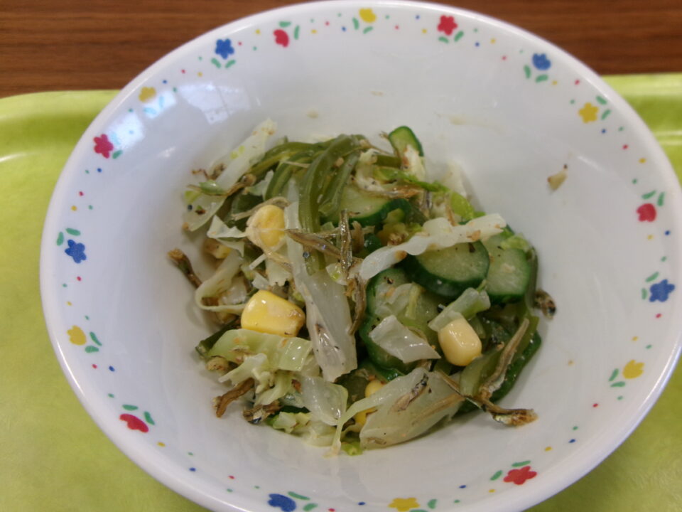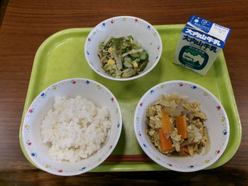 今日きょう給食きゅうしょくは、ごはん麦入むぎいり)、牛乳ぎゅうにゅう豚肉ぶたにく柳川風やながわふう、キャベツと小魚ざかなのサラダでした。