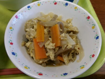 今日の給食は、ご飯(麦入り)、牛乳、豚肉の柳川風、キャベツと小魚のサラダでした。