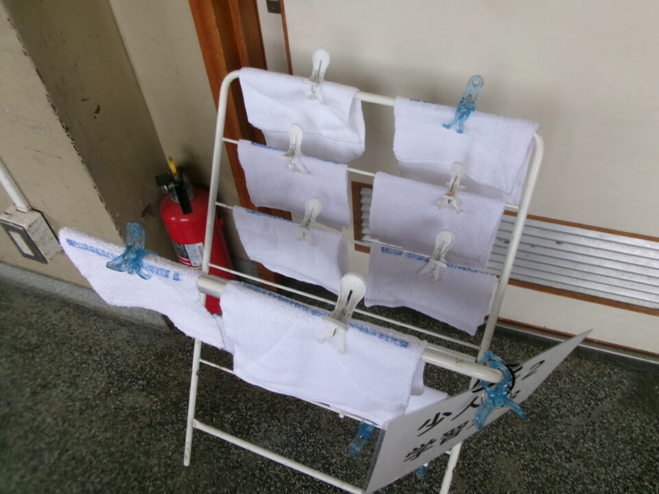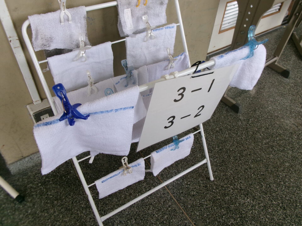 6月になりましたので、ぞうきんを新しいものに交換しました。子どもたちには、汚れて真っ黒になったぞうきんではなく、一定の期間で交換して新しく使いやすいものにしていきます。青い線でかけて、ピンチではさむようになっています。