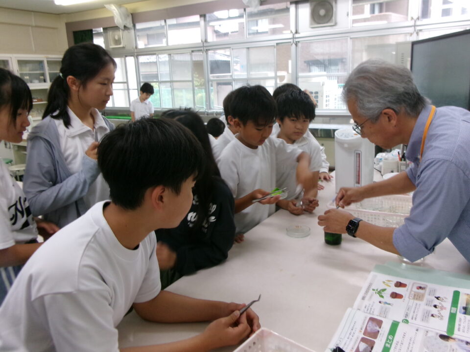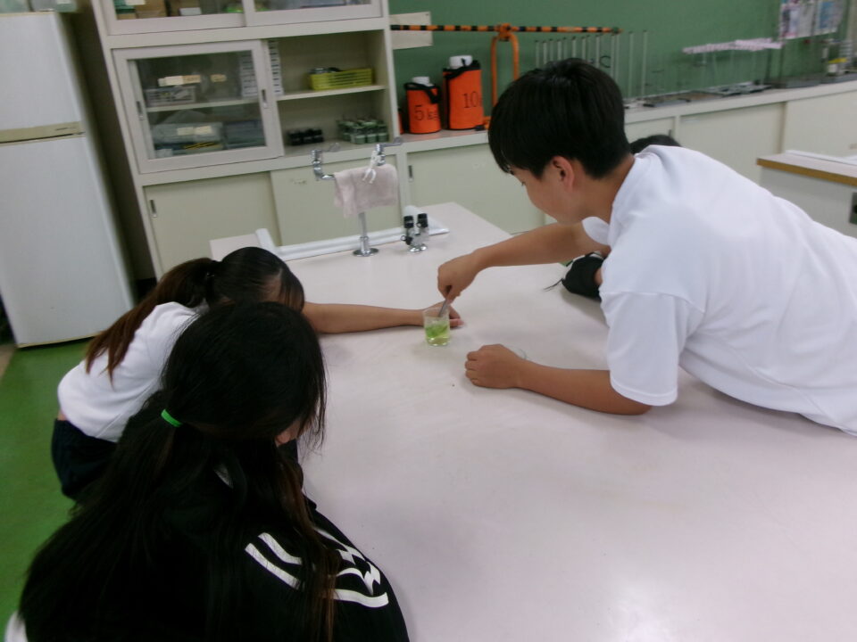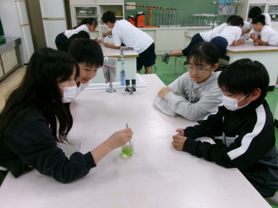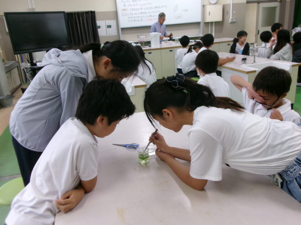 理科室では、実験をしていました。葉をお湯につけて葉緑素をぬいていますね。このあと、ヨウ素液につけてどうなるか観察です。
