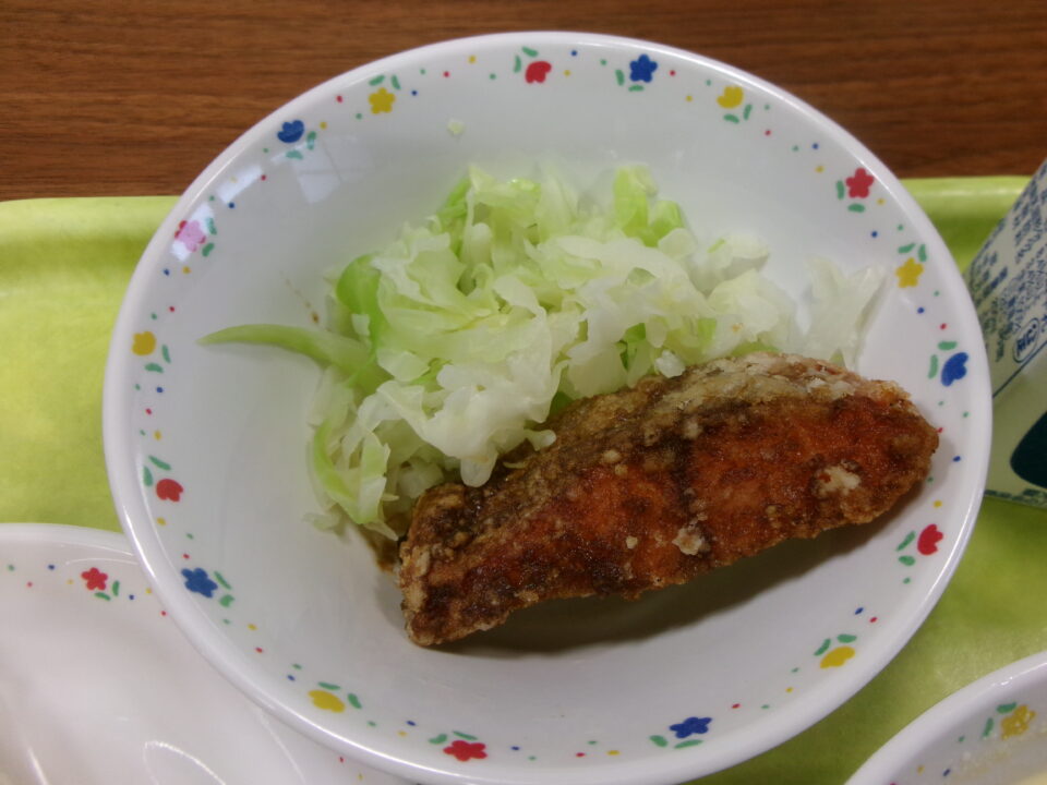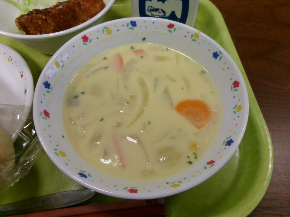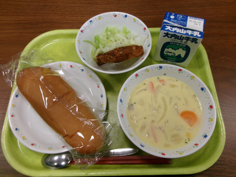 今日の給食は、コッペパン(横切り)、さけフライ、キャベツ、牛乳、コーン豆乳スープでした。