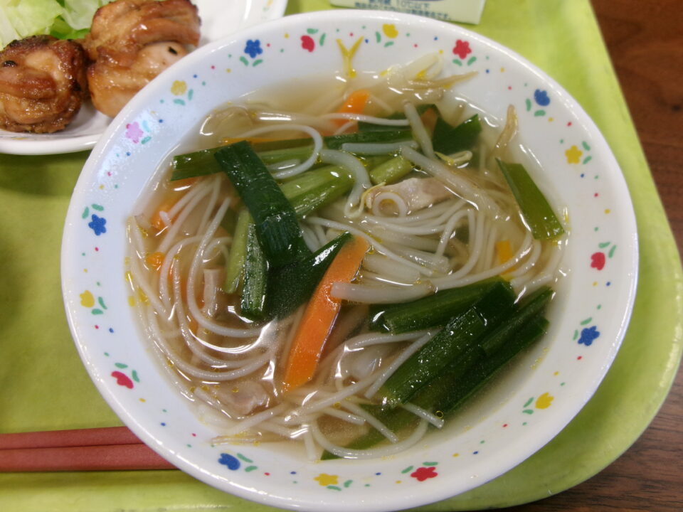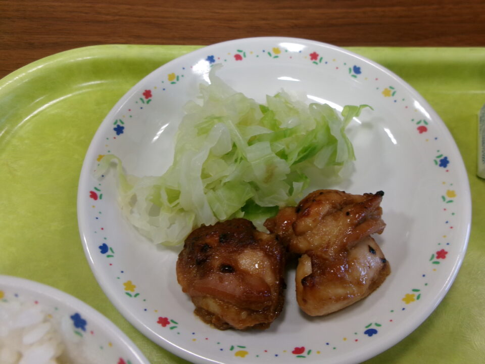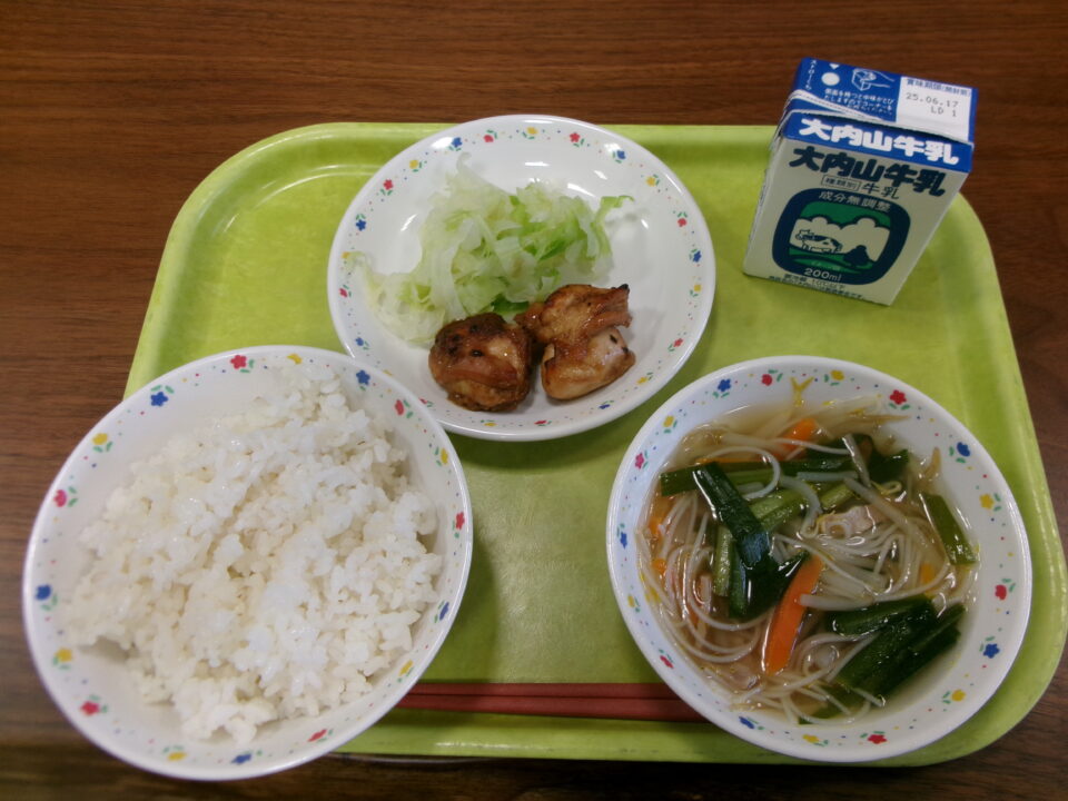 はん麦入むぎいり)、牛乳ぎゅうにゅう松阪まつさかとりにくえキャベツ、ビーフン中華風ちゅうかふうスープでした。