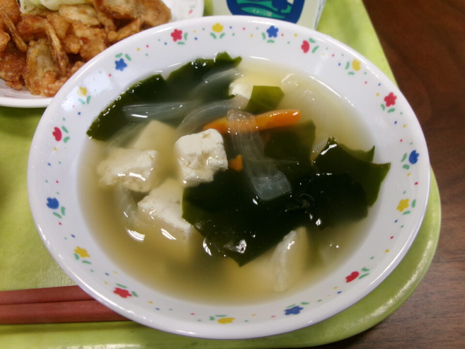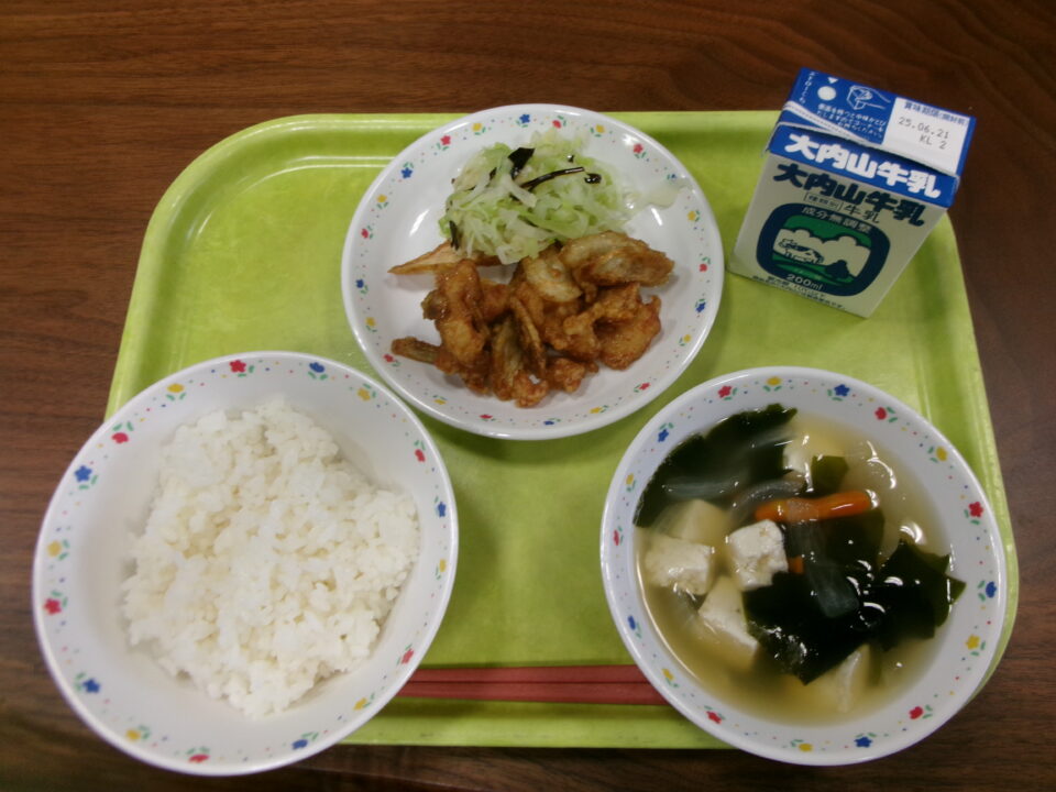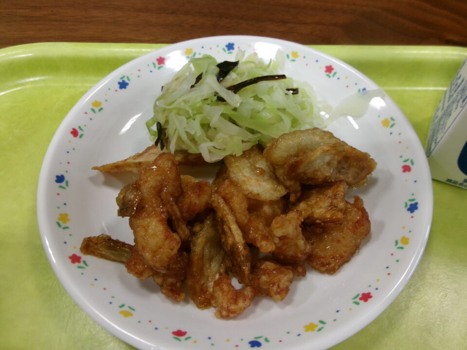 今日の給食は、ご飯、牛乳、チキンチキンごぼう、キャベツの塩昆布和え、わかめスープでした。