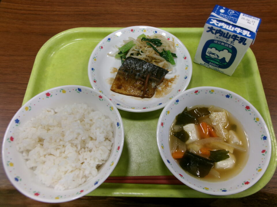 今日きょう給食きゅうしょくは、ごはん麦入むぎいり)、牛乳ぎゅうにゅう、さばのみそ、もやしと小松菜こまつなのごまえ、すましじるでした。